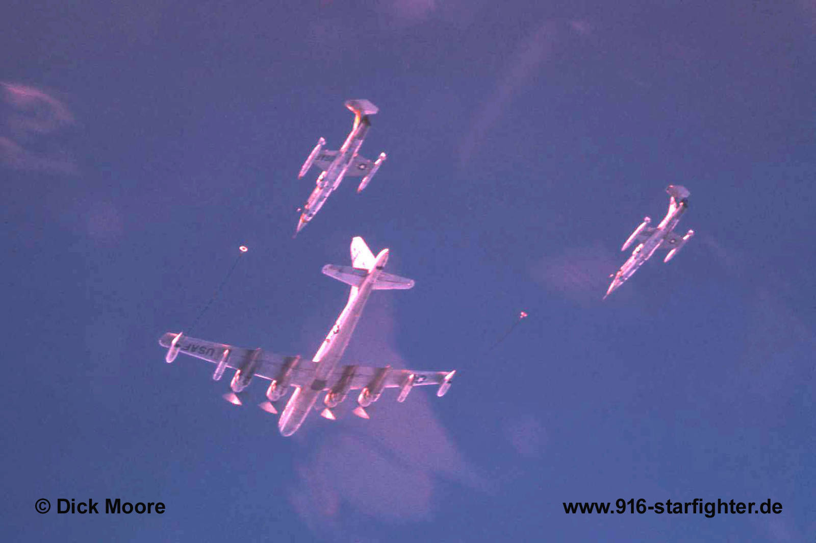 F-104C "60923" 436th TFS "Black Aces" refuels from a KB-50J "Superfortress" tanker 1959 F-104C, construction number 183-1211, model 483-04-05, serial number 56-0923, built by Lockheed delivery date February 6, 1959; 479th TFW 436 TFS 1960 crashed June 26, 1961 after midair collision with 57-0917 near Charlottesville, Virginia, written off, the pilot ejected safely and was not injured. The Boeing KB-50 tanker was a modified Boeing B-50 Superfortress for air refueling needs by the USAF. The first KB-50 flew in December 1955 and was accepted by the Air Force in January 1956. KB-50J (J for Jet) was a B-50 tanker with improved performance, via two extra General Electric J47 turbojets under the outer wings. copyright © Dick Moore