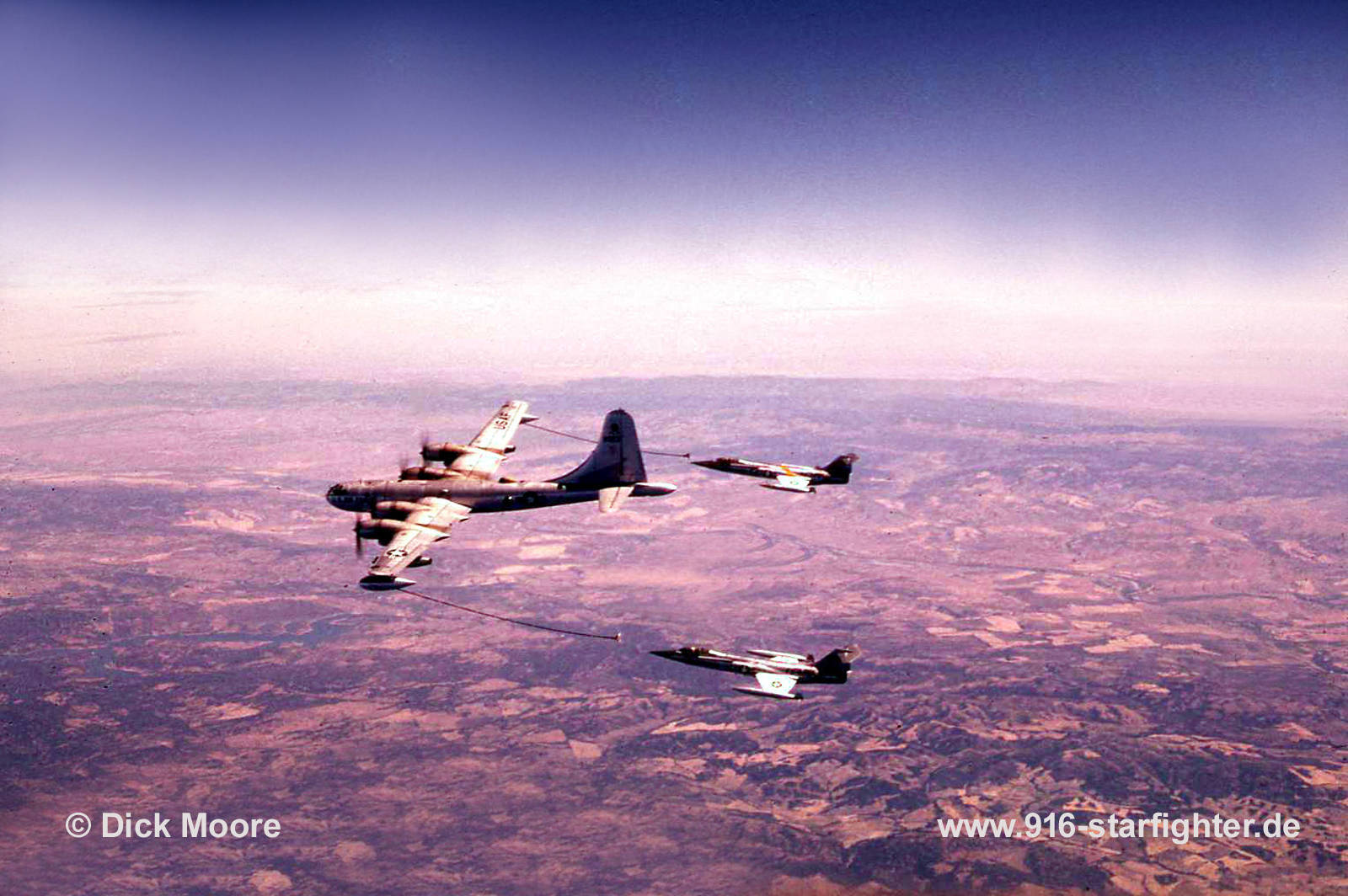 F-104C "60923" 436th TFS "Black Aces" refuels from a KB-50J "Superfortress" tanker 1959 F-104C, construction number 183-1211, model 483-04-05, serial number 56-0923, built by Lockheed delivery date February 6, 1959; 479th TFW 436 TFS 1960 crashed June 26, 1961 after midair collision with 57-0917 near Charlottesville, Virginia, written off; the pilot ejected safely and was not injured. The Boeing KB-50 tanker was a modified Boeing B-50 Superfortress for air refueling needs by the USAF. The first KB-50 flew in December 1955 and was accepted by the Air Force in January 1956. KB-50J (J for Jet) was a B-50 tanker with improved performance, via two extra General Electric J47 turbojets under the outer wings copyright © Dick Moore