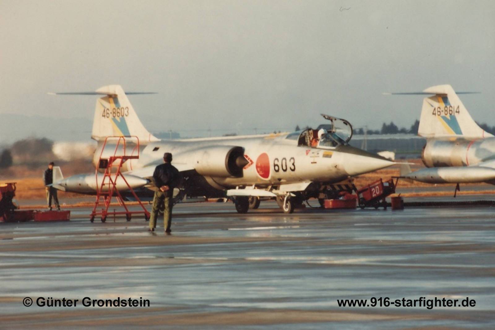 F-104J "603" 204 Hikotai (squadron) at Nyutabaru AB 1980 F-104J, construction number 683B-3103, model 683-07-14, JASDF serial number 46-8603, built by MitsubishiMitsubishi built; delivery date July 2, 1964; first unit 202nd Hikotai of 5th Kokudan at Nyuutabaru AB; later to 203rd Hikotai of 2 Wing until 1975; next to 204th Hikotai of 5 Kokudan in 1979 to 202nd Hikotai of 5 Wing; in 1983 to 204th Hikotai of 5 Wing; withdrawn from use May 30, 1984 November 5, 2005 display at Kasuga AB, Fukuoka Prefecture first noted; November 5, 2005 noted; August 4, 2012 noted; January 2024 noted.