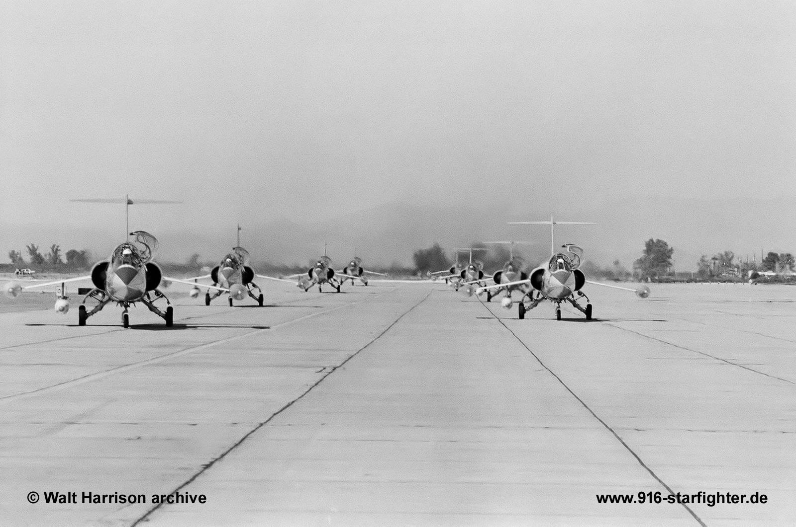 The Starfighter taxi in position in front of the reviewing stand When the 4540th CCTG was activated on April 1, 1964, Col. J. D. Collingsworth assumed and remained in that position until June 14, 1964. On June 15, 1964, the unique GAF training program received a famous commander to guide it through the embryonic first year, Col. James Jabara, America's first jet ace and second ranking ace of the Korean War, assumed command and headed the group until May 1965. On February 12, 1964 the first F-104G was flown in from Palmdale, California, by Capt. Charles E. Ball, the Luke instructor pilot who had remained at George. By mid July 1964, 23 TF-104Gs and 12 F-104Gs were assigned to Luke. A separate military sales case (i.e., program package) had been negotiated with the German government in 1963 for the modification of the German aircraft used in the program. Although the aircraft belonged to the GAF, all were painted with USAF codes and marks. copyright © Walt Harrison archive