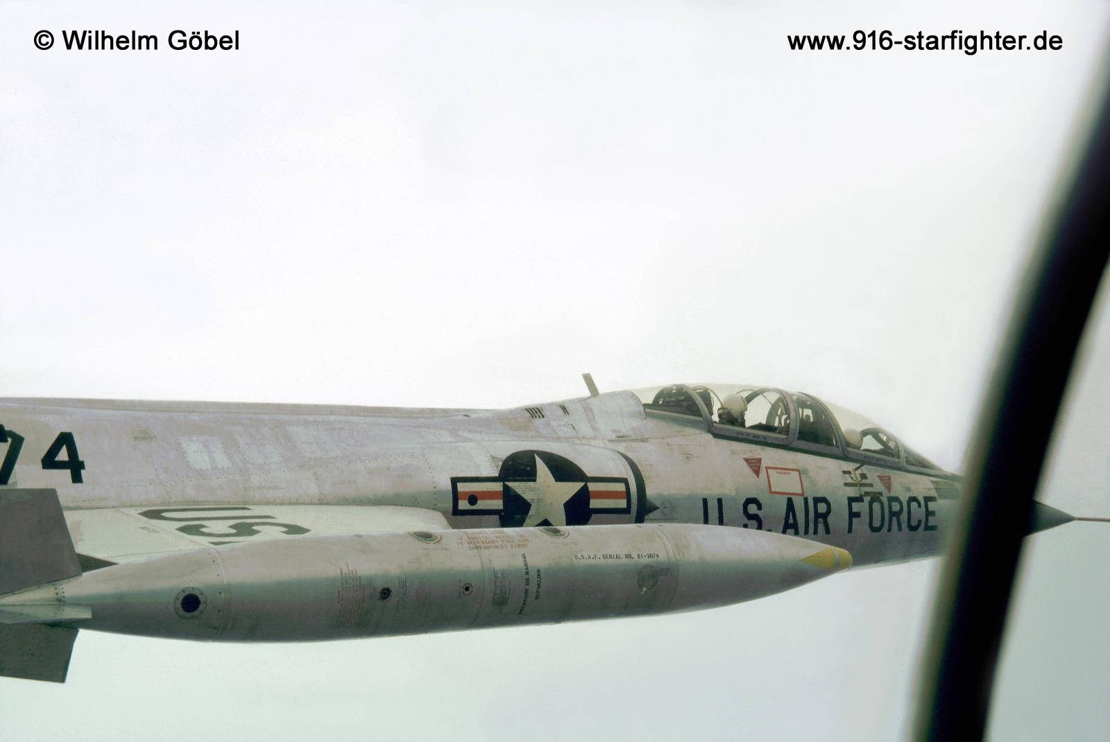 TF-104G "FG-074" (61-3074) 1964 TF-104G, construction number 583D-5745, model 583-10-20, US serial number 61-3074, built by Lockheed manufactured by Group USA (ARGE-USA); assembly at Lockheed-Palmdale for Germany; first flight 1963 coded with US serial number "61-3074"MAP to Germany at Luke AFB in USAF Silver-finish colors; operated by the 4510 CCTW (shadow serial number 2743, never used for registration) coded FG-074 later coded 13074; flown until end of operation at Luke AFB on March 16, 1983; struck off charge order (AVA) July 19, 1983 sold to USAF with "Phase III" lot with 2.549 flight hours