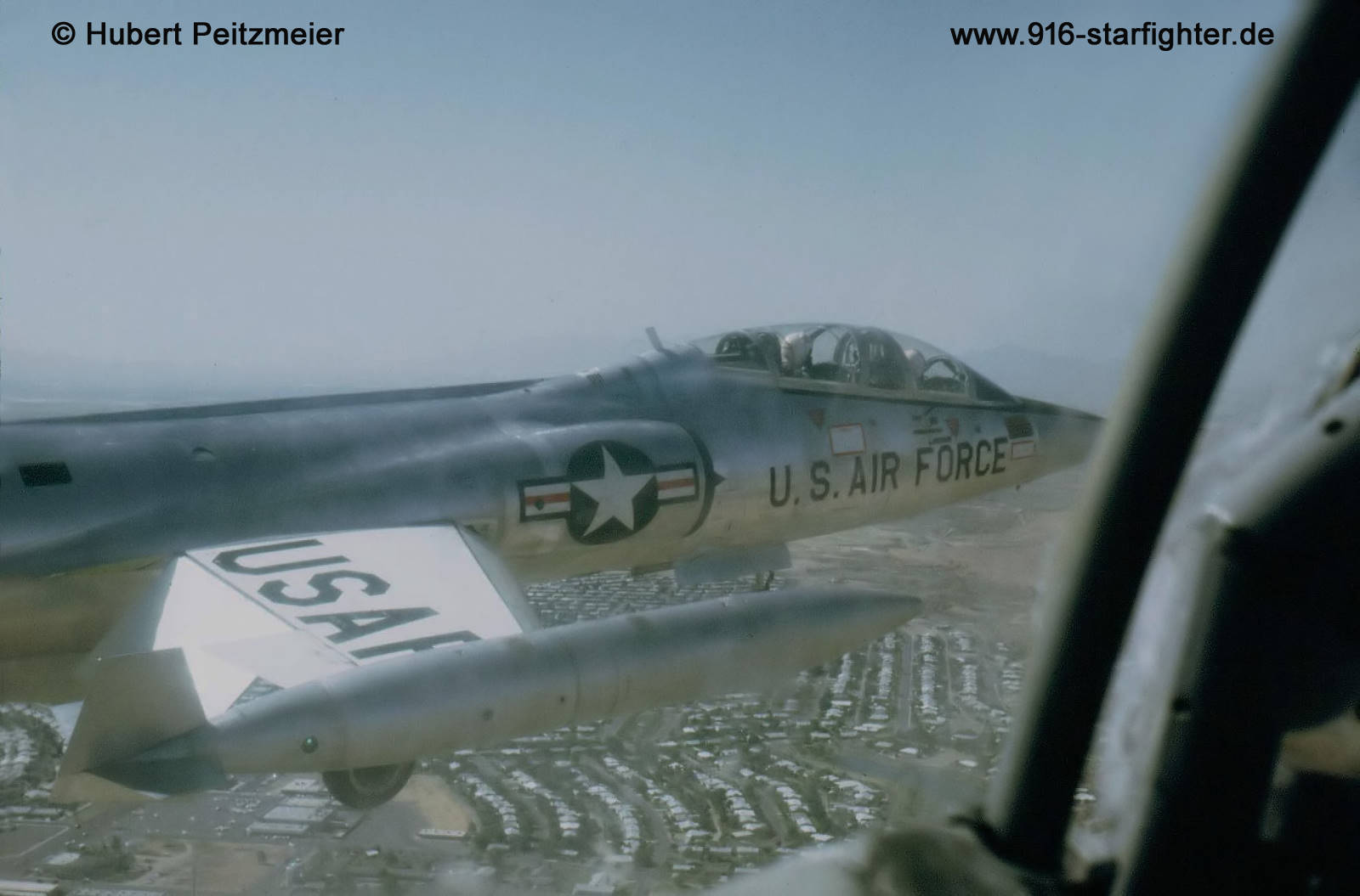 TF-104G on final at Luke AFB 1968 October 1, 1976 F-104 program began scaling down with inactivation of 418th Tactical Fighter Training Squadron. August 29, 1979 58th Tactical Training Wing conducted F-4/F-104/F-15/F-5 training. Span of control problems led to activation of second wing, 405th Tactical Training Wing, to assume F-5/F-15 programs while 58th Tactical Training Wing retained F-4/F-104 programs. copyright © Hubert Peitzmeier