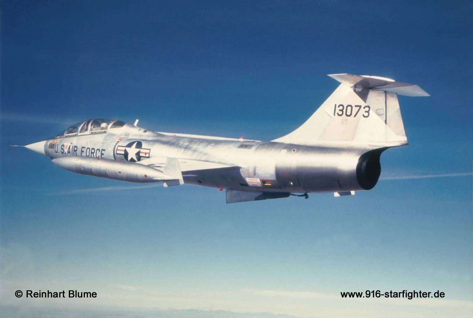 TF-104G "13073" (61-3073) leading into the Training Area 1970 TF-104G, construction number 583D-5744, model 583-10-20, US serial number 61-3073, built by Lockheed manufactured by Group USA (ARGE-USA); assembly at Lockheed-Palmdale for Germany; first flight 1963 coded with US serial number "61-3073"operated at Luke AFB by the 4510 CCTW coded 13073 (German shadow serial number 2742, never used for registration) in USAF Silver-finish colors 2.970 flight hours in May 1977; long term storage in August 1979; struck off charge order (AVA) January 24, 1983; sold to USAF in 1983 with "Phase I" lot
