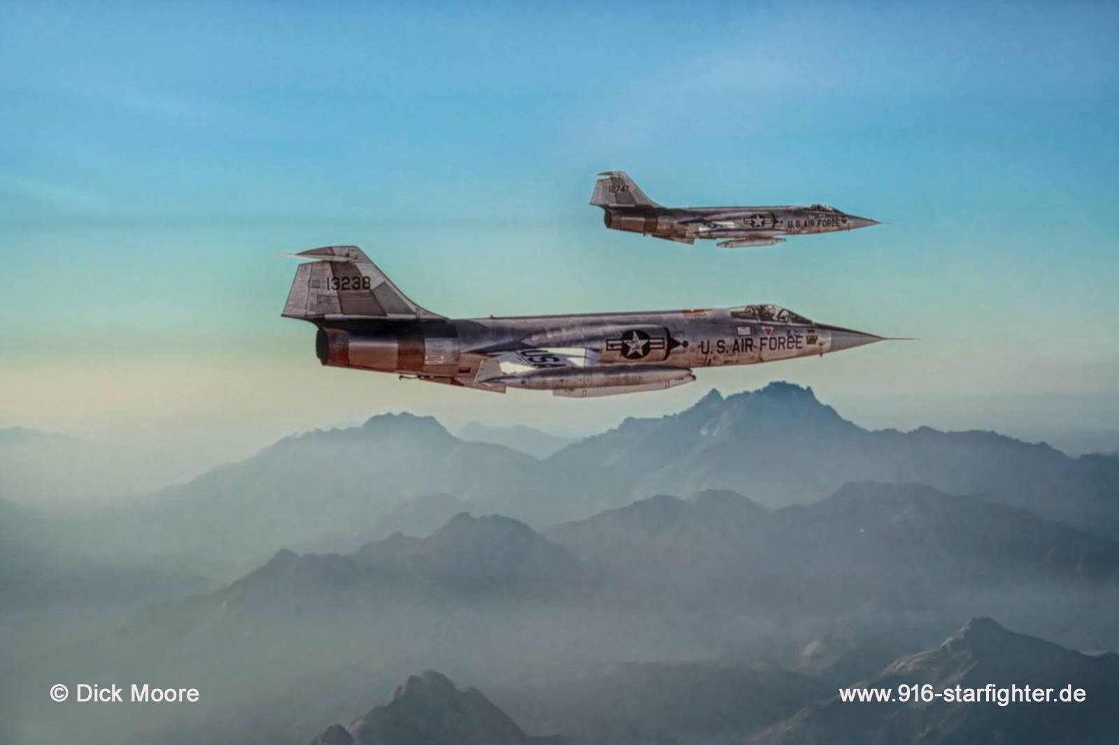F-104G "13238" (63-13238) 58 TFTW (58 Tactical Fighter Training Wing) Luke AFB 1971 F-104G, construction number 683-2021, model 683-10-19, US serial number 63-13238, built by Lockheed manufactured by Group USA (ARGE-USA); assembly in Fighterbomber version according contract lot 3 flight test release October 27, 1961; flown with register number "121" for test flights at Lockheed-Palmdale; coded DA+118 for delivery with 25 flight hours project "42" as Fighterbomber (for JaboG 31) with Vulcan M61 20 mm machine gun installed and long range tanks as loose parts shipped to Bremerhaven, Germany on October 31, 1961; first flight with Messerschmitt on March 20, 1962 acceptance date March 30, 1962 by BABwMTT; JaboG 31 at Norvenich AB delivery date on April 3, 1962 in Silver-finish colors; JaboG 33 at Buchel AB on July 26, 1962 DR+118 to LPR 1 at Erding AB on March 15, 1963 for project "Balance" to upgrade to higher level standards planned for project "Columbus" on November 15, 1962; coded BG+126 according project "Columbus" airlifted to USA on March 28, 1963 to Lockheed-Burbank reassembled and modified to the latest modification level at Lockheed-Palmdaleoperated by the 4510th CCTW (German shadow serial number 2017) in USAF Silver-finish color scheme coded 13238 1976 stored due to fatigue cracks with 2.015 flight hours and repaired; flown until end of operation at Luke AFB on March 16, 1983 struck off charge order (AVA) July 21, 1983; sold in July 1983 to USAF with "Phase II" lot