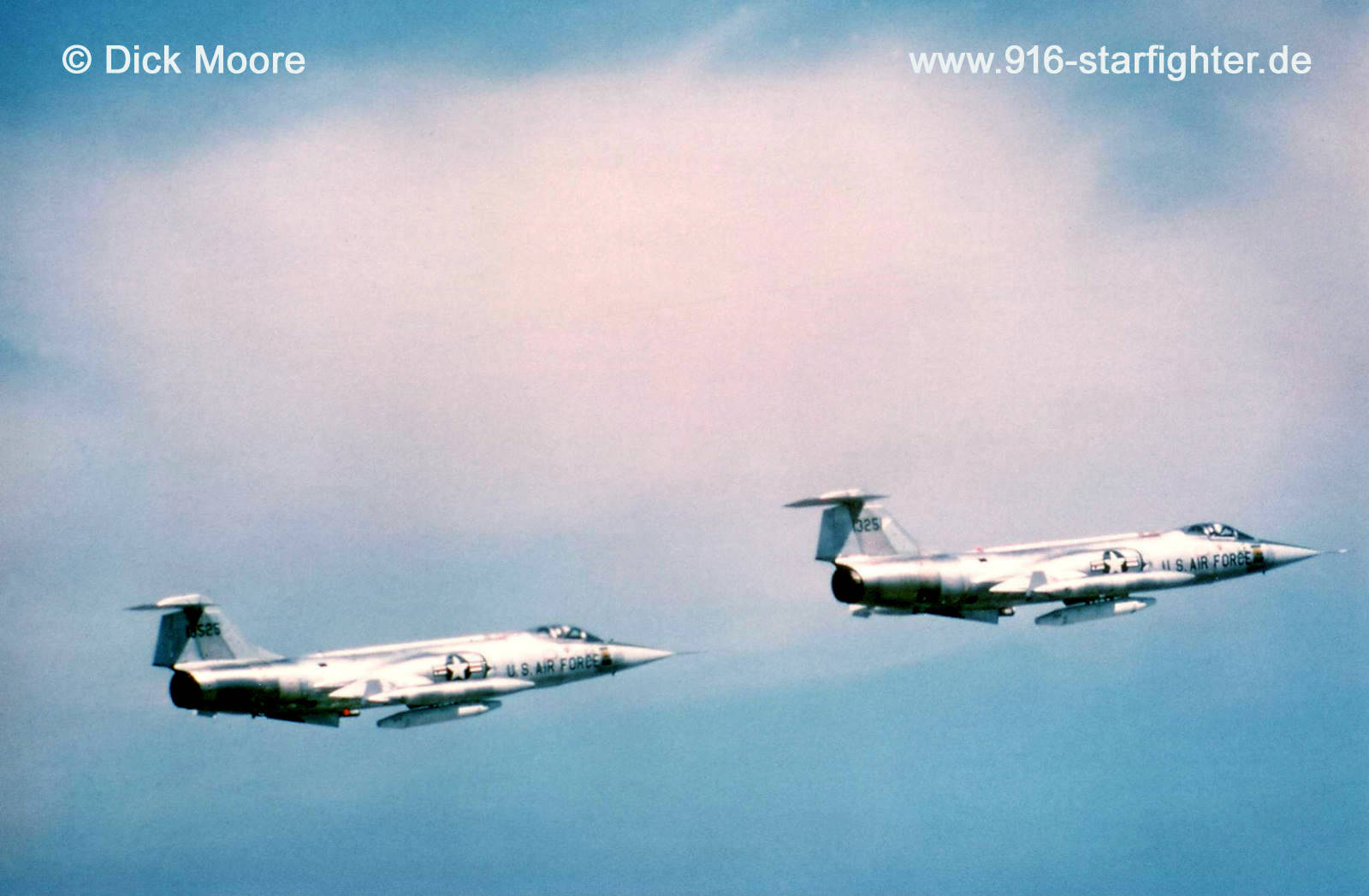 F-104G "13251" (63-13251) going into the Luke Air Force Range 1968 F-104G, construction number 683-2035, model 683-10-19, US serial number 63-13251, built by Lockheed manufactured by Group USA (ARGE-USA); assembly in Fighterbomber version according contract lot 4 Lockheed delivery date October 27, 1961 coded "135"; KF+111 airlifted to Germany November 15, 1961 with 16 flight hours project "42" as Fighterbomber (for JaboG 31) with Vulcan M61 20 mm machine gun installed and long range tanks as loose parts; Messerschmitt test flight January 15, 1962 DA+239 JaboG 31 at Norvenich AB delivery date on March 19, 1962 in Silver-finish colors planned for project "Columbus" on November 15, 1962; to Messerschmitt for disassembly on February 14, 1963 according project "Columbus" airlifted coded BG+119 on March 7, 1963 to Lockheed-Burbank, USAreassembled and modified to the latest modification level at Lockheed-Palmdale in May 1963 to 4510th TFTW Luke AFB (German shadow serial number 2028) in USAF Silver-finish color scheme, operated coded 13251 severe landing accident on February 6, 1969 on Rwy 21R, after a Ground Attack Tactical (GAT) mission the aircraft nose started up and pitched down sharply during landing flare the F-104 impacted the overrun and the undercarriage collapsed, the aircraft continued to slide down the Rwy for about 4.500 feet, the pilot was unharmed repaired at Lockheed and back to flying operations; in 1976 temporarily grounded due to fatigue cracks, repaired and back to flying operations with 2.509 flight hours in May 1977 into long term storage later; struck off charge order (AVA) January 24, 1983; sold to USAF with 2.784 flight hours with "Phase I" lot