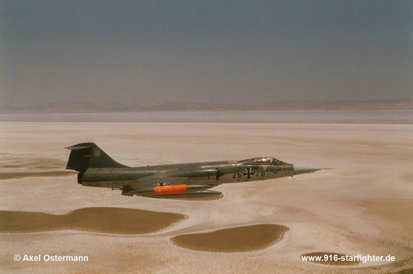 F-104G "26+78" of MFG 2 over sandy coastline, Turkey photo taken by Axel Ostermann on a Squadron Exchange in July 1986 with Turkish Air Force 161 Filo (squadron) at Bandirma AB