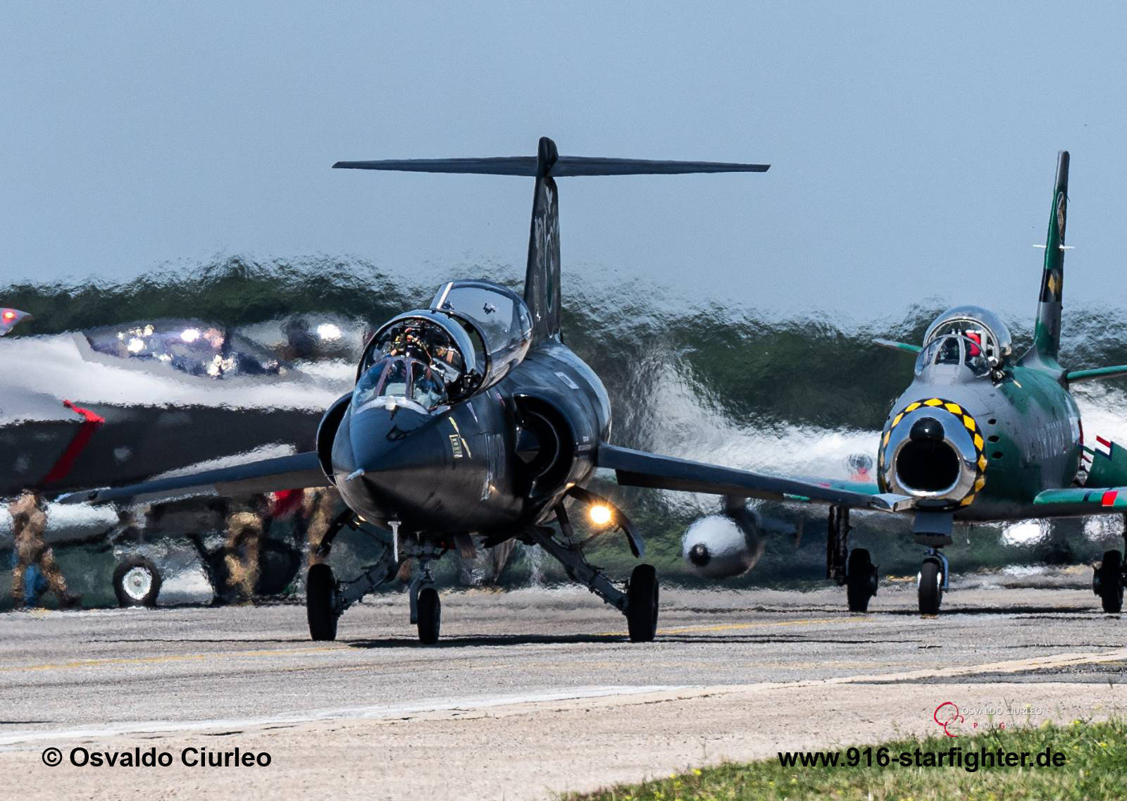 TF-104G-M "N991SF" "Starfighters" taxi at the AMI 100th anniversary at Pratica di Mare AB June 18, 2023 TF-104G, MM54258, construction number 583H-5209, model 583-10-20, built by Lockheed For this occasion the Aeronautica Militare collaborated with Florida-based Starfighters Aerospace to bring one of that company’s airworthy, Italian-built F-104 back to the nation of its birth. Former Italian Air Force TF-104G MM54258, nicknamed "Black Beauty", was shipped from Cape Canaveral to Grosseto Air Base, home to 4° Stormo (4th Wing), and the one-time base of this very airframe. Starfighter Aerospace personnel reassembled the airframe, in cooperation with a former Starfighter crew chiefs. On Tuesday June 13, 2023 Black Beauty flew in Italian skies almost twenty years since the type’s last flight over the nation. After flight testing was complete, PierCarlo Ciacchi flew the TF-104G to Pratica di Mare to join in this weekend’s festivities. copyright © Osvaldo Ciurleo