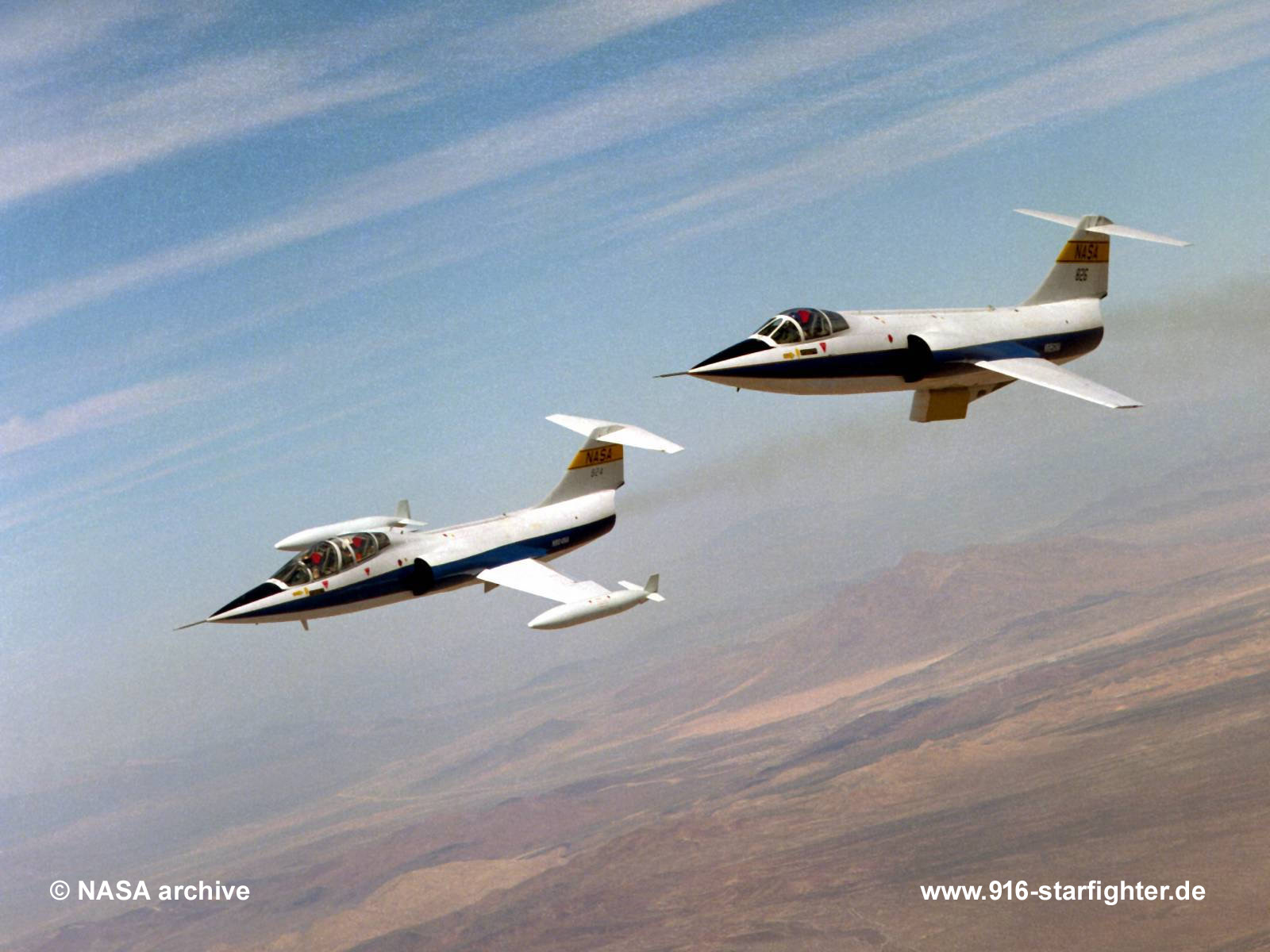 TF-104G "824" (5735) chasing "826" on a thermal protection system (tiles) flight test in 1992 TF-104G, construction number 583D-5735, model 583-10-20, US serial number 61-3064, built by Lockheed manufactured by Group USA (ARGE-USA); assembly at Lockheed, Palmdale; first flight 1963 coded with US serial number "61-3064"MAP to Germany acceptance date May 21, 1963 by BABwLockheed; KE+235 airlifted to Germany on June 10, 1963 with 10 flight hours DA+064 for test flight by Messerschmitt on August 5, 1963; camouflage scheme "Norm 62" according tech order "TA-196" DC+367 JaboG 33 at Buchel AB delivery date on October 14, 1963 27+33 WaSLw 10 on June 26, 1975 for familiarization of NASA pilots; flown on June 27, 1975 from Jever AB to Edwards AFB,