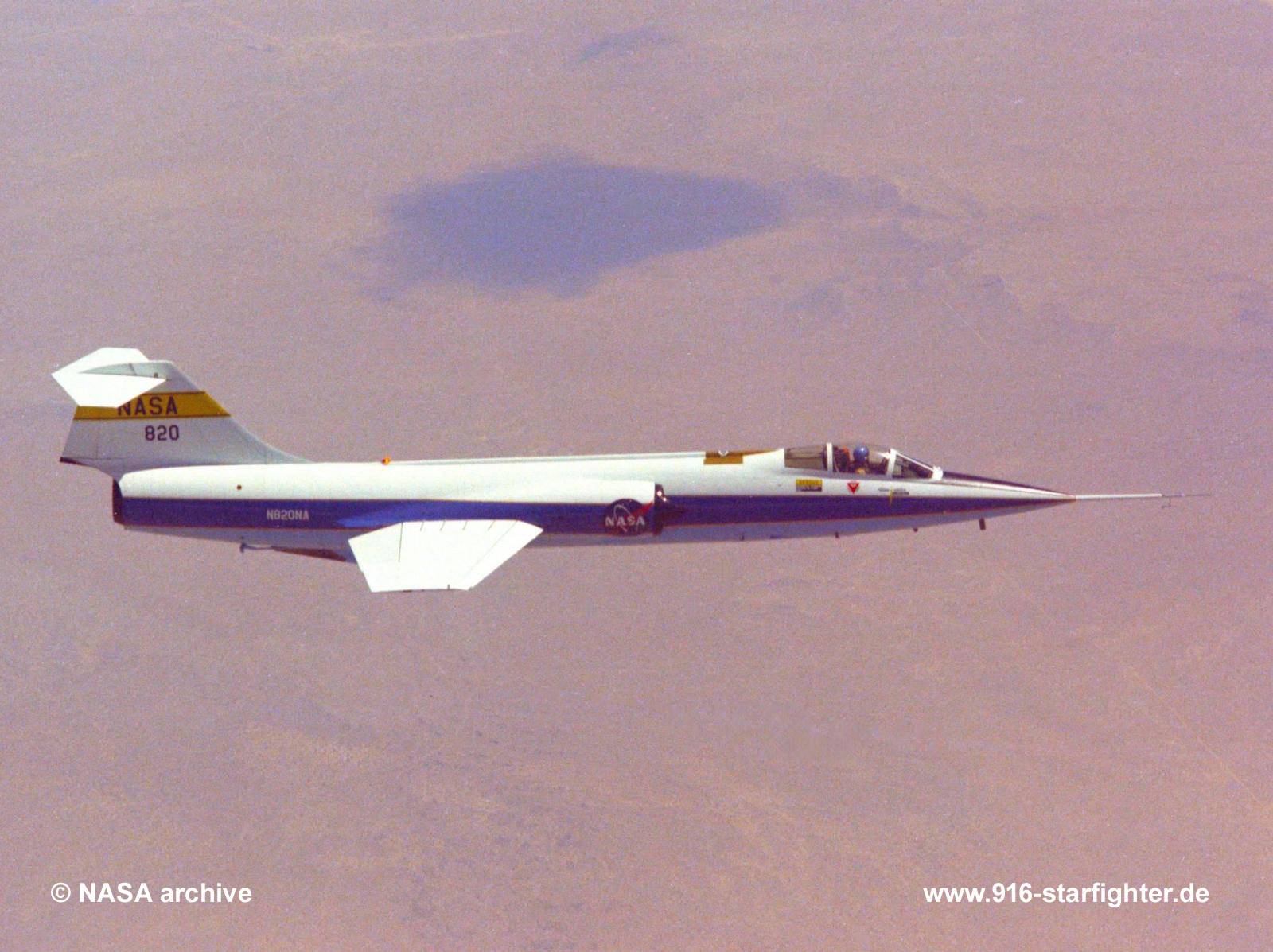F-104N "820" (56-0790) during a chase flight F-104A, construction number 183-1078, model 183-93-02, US serial number 56-0790, built by Lockheeddelivery date December 13, 1958, Air Force Proving Ground Center (Air Research and Development Command), Eglin AFB (May 1958-March 1959) FG-790 leased by Lockheed and modified 1959 to F-104G configuration (2.prototype F-104G) for system tests and nuclear weapons shape trials first flight as F-104G on June 7, 1960; all test were completed October 15, 1960 more test flights until July 31, 1961 after additional modifications and several improvements for some specific systems.