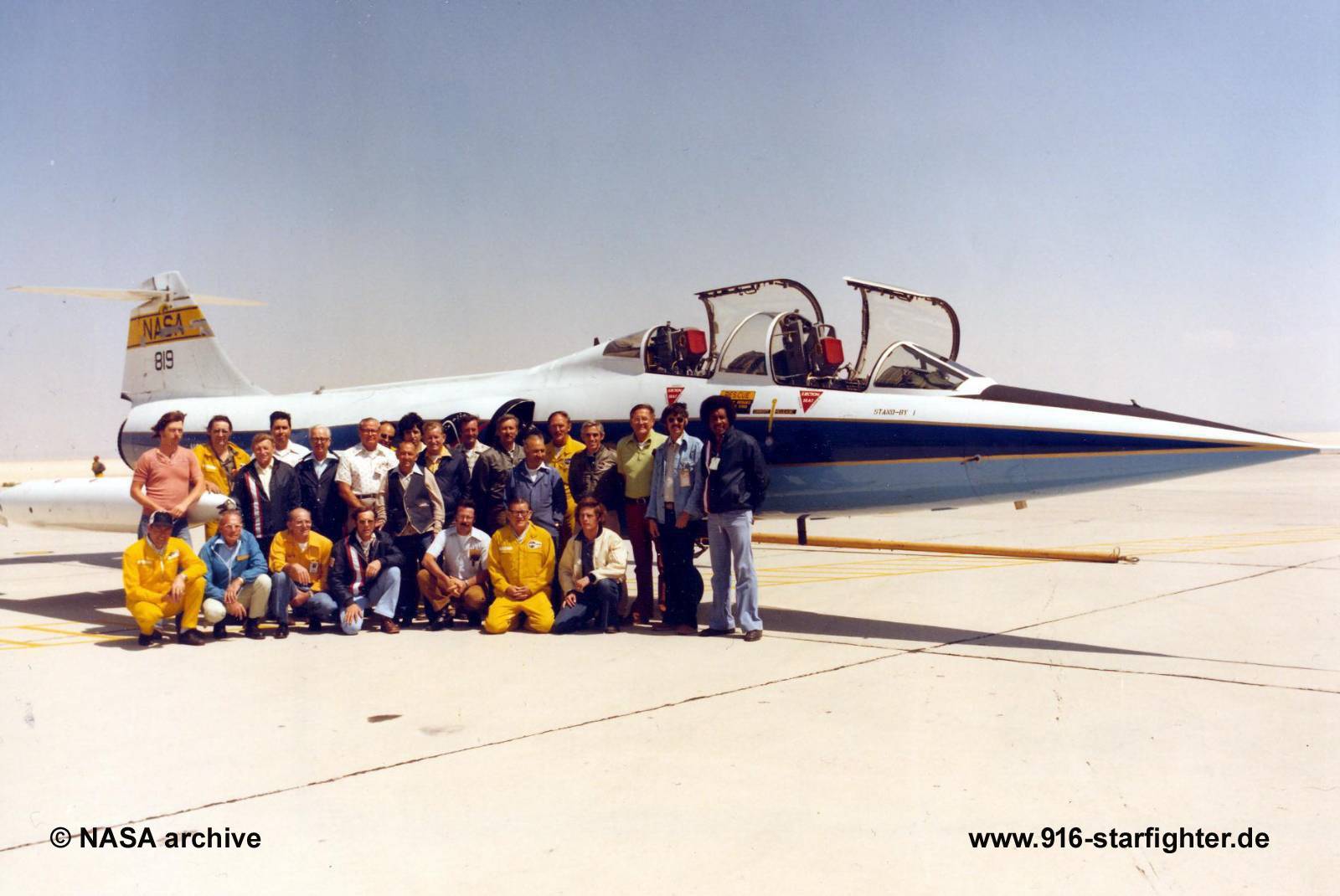 F-104B "819" (57-1303) N819NA with NASA Dryden crew commemorating her last flight in 1978 F-104A, construction number 283-5015, model 283-93-03, US serial number 57-1303, built by Lockheeddelivered to the Air Force on October 2, 1958, AFFTC support, used at Ames from October 3, 1958 to December 16, 1959 as 71303
