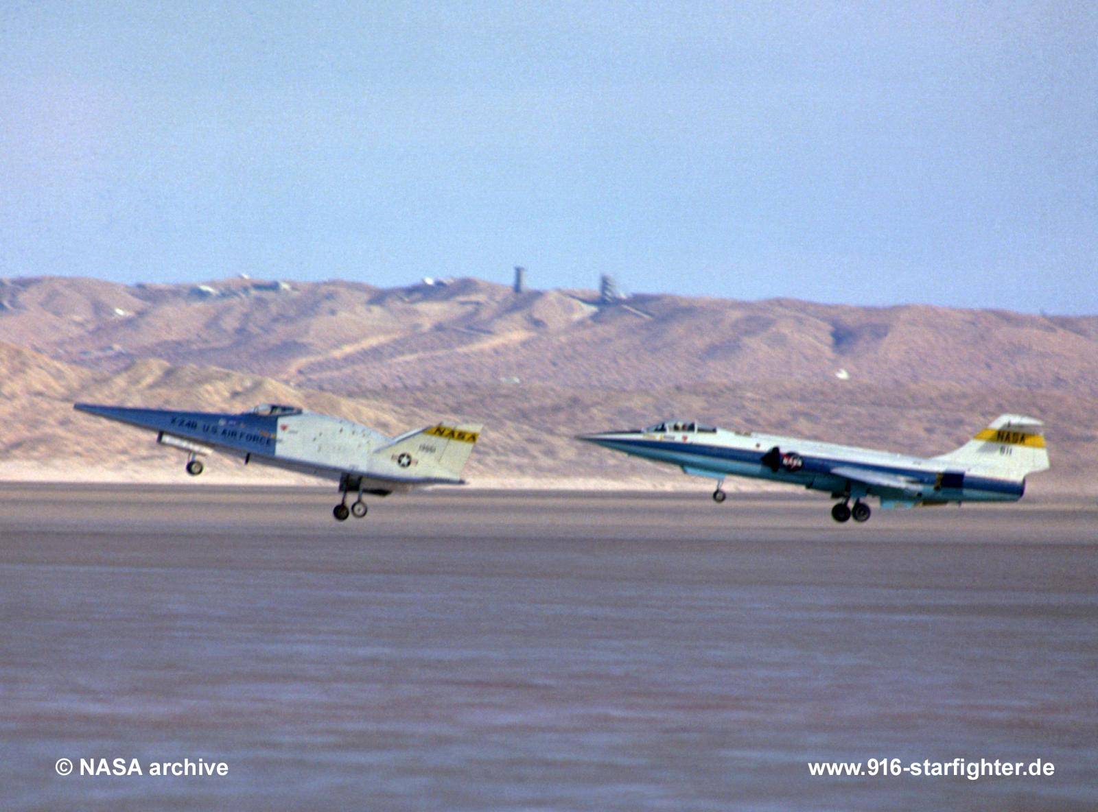 F-104N "811" (4045) chasing X-24B lifting body to a landing on Rogers Dry Lake, Edwards, CA, after a research flight 1972 F-104N, construction number 683C-4045, model 683-10-19, built by Lockheed[N811NA] F-104N officially delivered to the NASA on July 19, 1963; flown to NASA FRC August 19, 1963 (by Joe Walker) for high speed chase coded NASA 011 From the beginning it flew with code "011" and very bright NASA color scheme In 1970 it was resprayed into the well-known white-dark blue-light blue scheme which later changed into white-blue-white It got also recoded into N811NA. On October 23, 1987 it made the last official NASA research flight with Bill Dana at the controls operational storage until at least 1990, then it was officially phased out with a total of 4.370 fights accomplished In October 1992 it was seen at Edwards Air Base completely cocooned to protect the airframe from the outside environment preserved at Prescott, Arizona, with Embry Riddle Aeronautical University, first noted in 1997, September 2025 noted. copyright © NASA