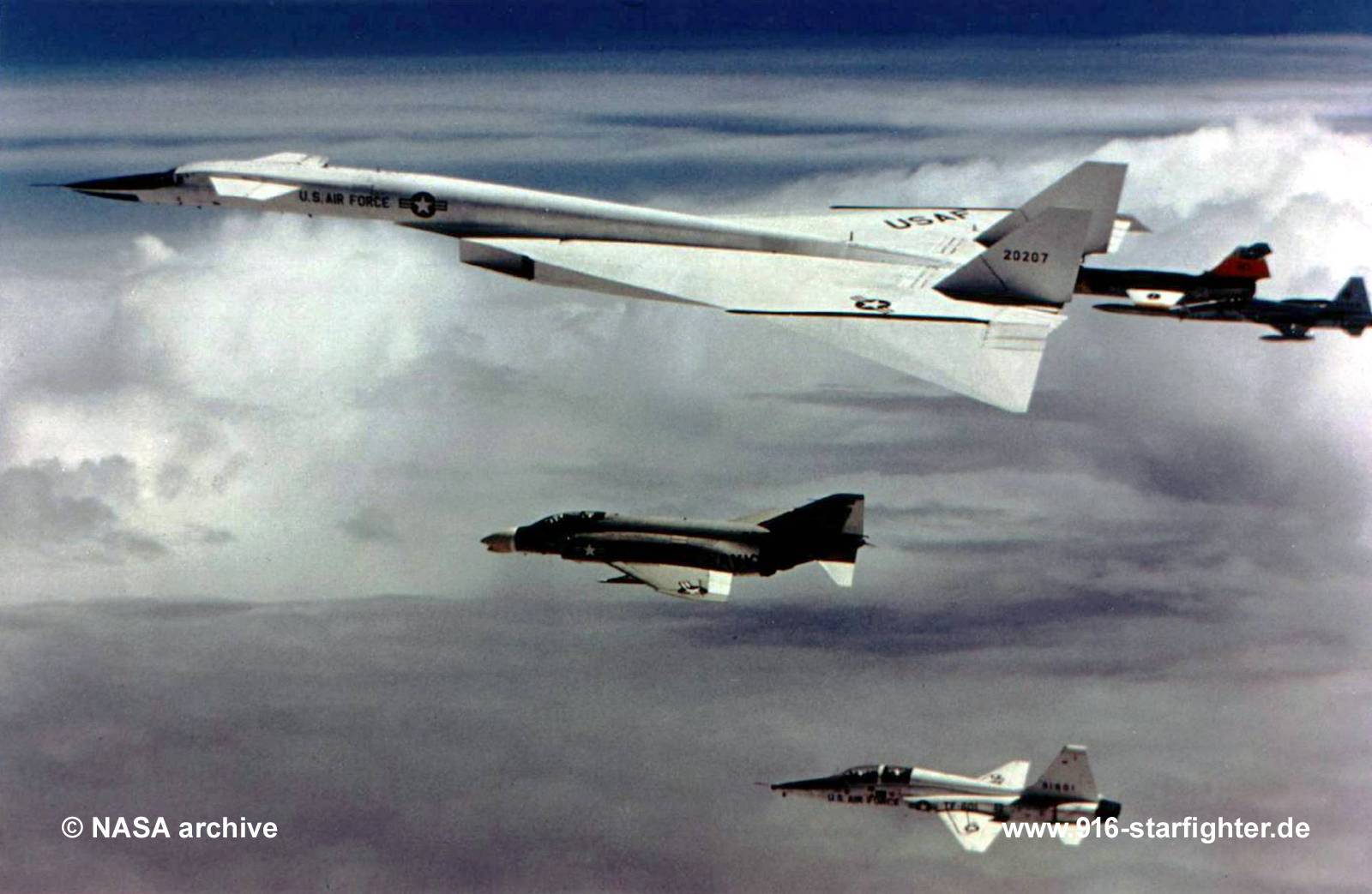 F-104N "813" (4058) chasing XB-70 just prior to the midair collision in 1966 F-104N, construction number 683C-4058, model 683-10-19, built by Lockheed[N813NA] F-104N (F-104G type), Construction Number: 683C-4058 4058 delivery date October 22, 1963 to the NASA arrived at the Flight Research Center on October 22, 1963 with 4.75 hours on the airframe for high speed chase flights It was piloted by Joseph A. Walker, and wore NASA tail number 013. Within a week, four other NASA pilots also flew 013 On November 1, 1963 Walker flew NASA 013 to "Yuletide" Special Operations Area northeast of Groom Lake, Nevada The flight was in support of the X-15 program. Groom Lake was a contingency landing site for the rocket plane following launches near Delamar, Nevada. NASA 013 frequently served as chase or weather observation aircraft for the X-15 The aircraft made its 235th flight coded NASA 013 on March 5, 1965, again piloted by Walker On its next sortie, flown by Milton O. Thompson on March 8 1965, the aircraft had been redesignated NASA 813 On November 29, 1965, Joe Walker flew NASA 813 as chase for the XB-70. Walker had been selected to become NASA's chief XB-70 pilot He made four additional XB-70 chase flights in November and December 1965, and seven more in March 1966 The aircraft was lost in a midair collision during a photo mission with the XB-70A-2 Valkyrie bomber (62-0702) on June 8, 1966 in a tragic accident killing Joe Walker. It was during its 409th flight. It was replaced by NASA 820 During its three-year service life, NASA 013 (later 813) flew a total of 409 NASA sorties and logged 627.7 flight hours. t was flown by nine different NASA pilots including Joseph A. Walker, Milton O. Thompson, Bruce Peterson, John "Jack" McKay, Donald Mallick, William H. Dana, Fred Haise, John Manke, and flight surgeon Dr. James Roman. Walker made 165 of the flights, more than any other pilot. copyright © NASA