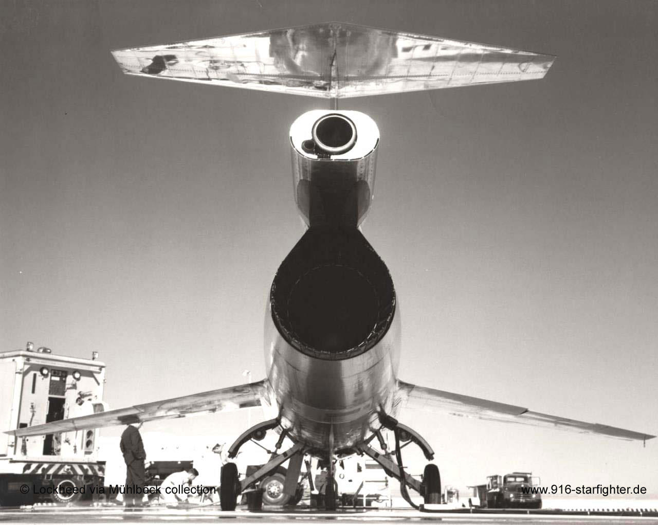 NF-104A with the booster tail In addition to the standard J79 jet engine a Rocketdyne AR2-3 rocket engine was fitted at the base of the vertical fin. This engine burned a mixture of JP-4 jet fuel and 90% hydrogen peroxide oxidizer solution. The NF-104 carried enough oxidizer for approximately 100 seconds of rocket engine operation. The thrust level could be adjusted to maximum or approximately half power by the pilot using an additional throttle lever on the left side of the cockpit. copyright © Lockheed via Mühlböck collection