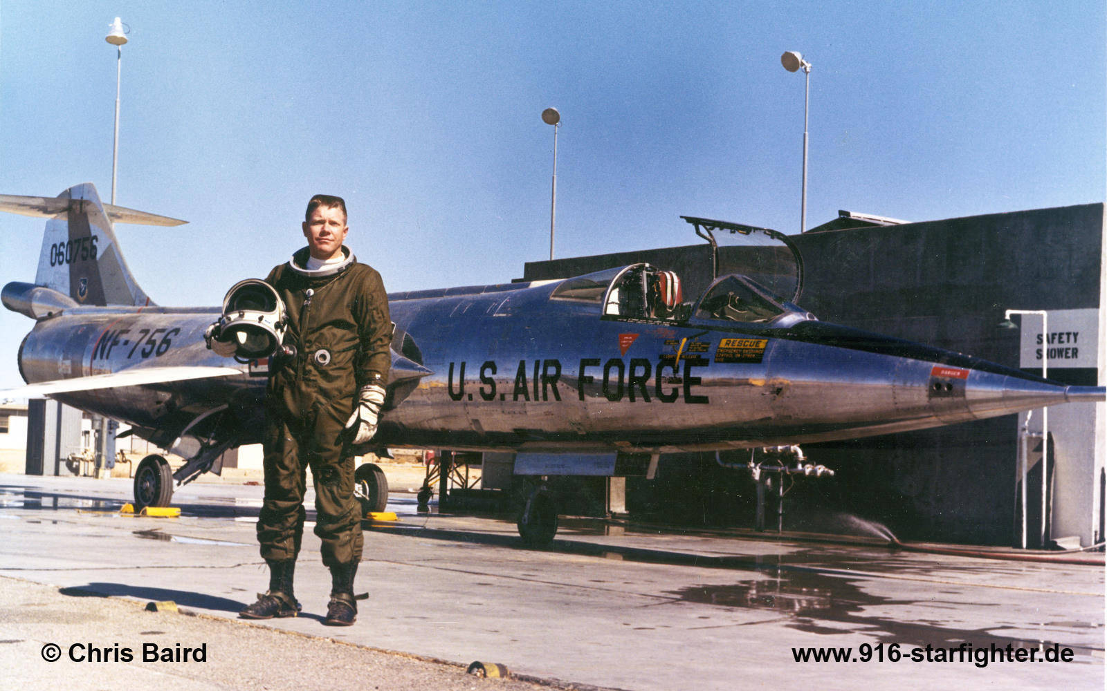NF-104A "NF-756" with instructor pilot Dean F. Vikan wearing the high-altitude "David Clark AP22S-2" full-body pressure suit The F-104 Starfighter fitted with an additional rocket engine was also regularly used in zoom climb research for future space flight. On May 7, 1958, the aircraft reached an altitude of 91,249 feet (27.81 km) in a zoom climb at Edwards Air Force Base, CAL. The Mach 2 mission took the airplane so high that the standard F-104’s jet engines routinely exceeded their temperature limits and had to be shut down. Sometimes the engine simply flamed out for lack of air. Then the pilot steered the aircraft like a returning spaceship to a lower altitude, where he would restart the engine. It was on one such "zoom climb" flights that test pilot Chuck Yeager was nearly killed flying a heavily modified F-104 on December 10, 1963 Without engine power, the cockpit would de-pressurize on these missions. Consequently, for protection against the rarified atmosphere, the pilot wore a full-body pressure suit. Properly outfitted with an airtight helmet and suit the pilot received breathing oxygen without ill effects. copyright © Chris Baird