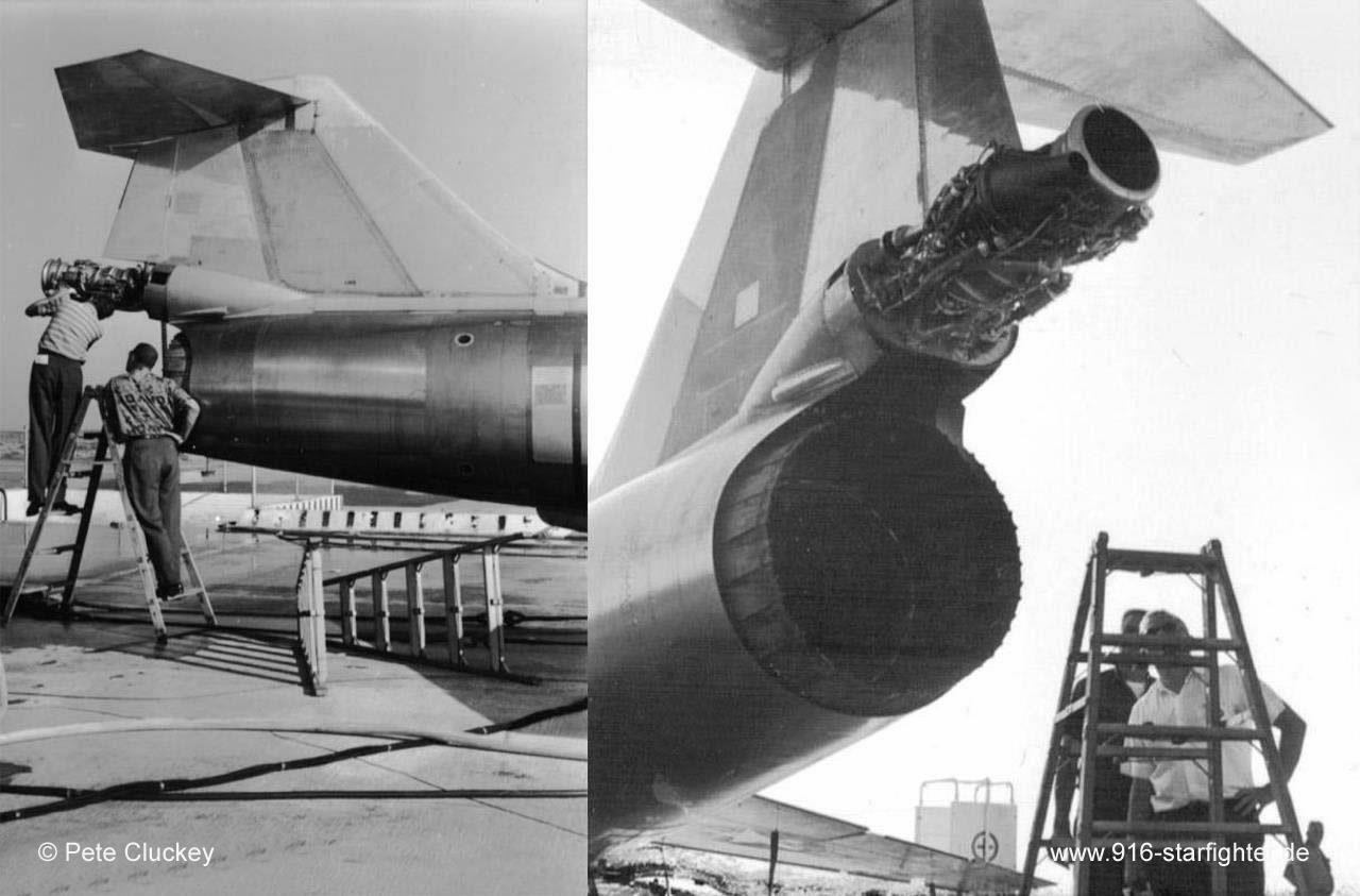 NF-104A "Rocketdyne AR2-3" Rocket Engine In addition to the standard J-79 jet engine a Rocketdyne AR2-3 rocket engine was fitted at the base of the vertical fin. This engine burned a mixture of JP-4 jet fuel and 90% hydrogen peroxide oxidizer solution. The NF-104 carried enough oxidizer for approximately 100 seconds of rocket engine operation. The thrust level could be adjusted to maximum or approximately half power by the pilot using an additional throttle lever on the left side of the cockpit. copyright © Lockheed via Pete Cluckey