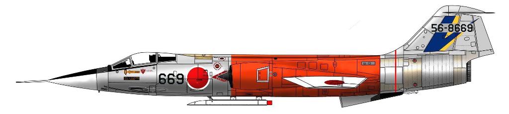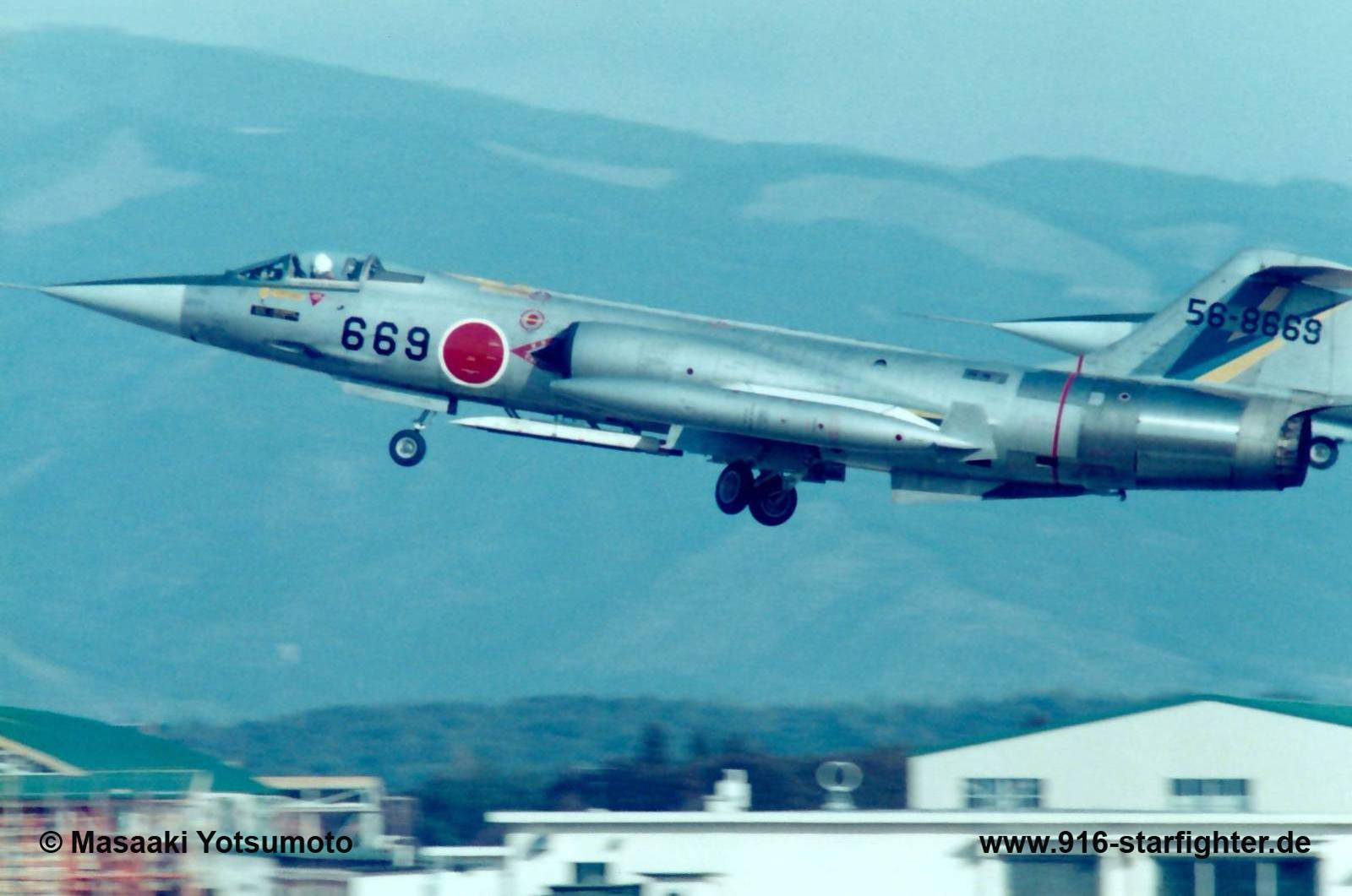 F-104J "669" 204 Hikotai after take-off at Nyutabaru AB January 10, 1984 F-104J, construction number 683B-3169, model 683-07-14, JASDF serial number 56-8669, built by MitsubishiMitsubishi built; delivery date March 7, 1965; first unit unknown; 1974 to 206 Hikotai of 7 Kokudan 204 Hikotai of 5 Kokudan carrying an orange band over its central fuselage during ACM exercise at Chitose AB in October 1979; 207 Hikotai in 1984 207 squadron November 6, 1984 with shark mouth; withdrawn from use in November 1991 at Gifu AB; scrapped. copyright © Masaaki Yotsumoto