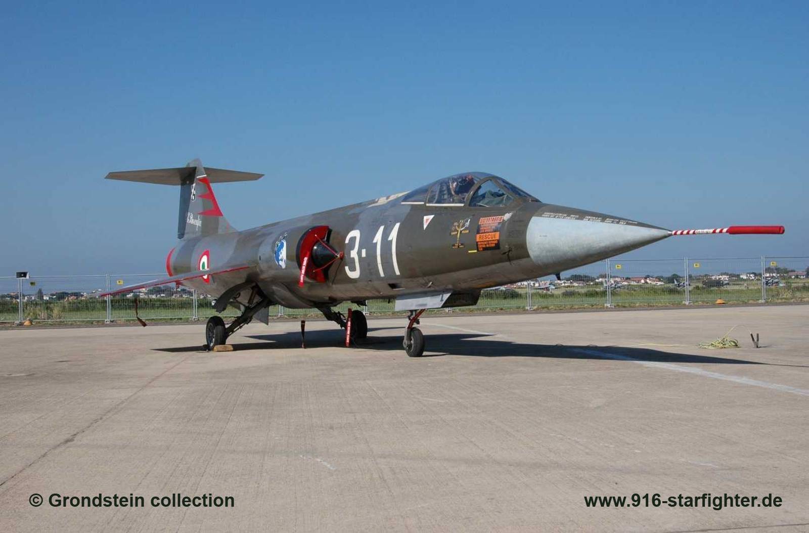 F-104G "3-11" 132°Gruppo of 3°Stormo "Carlo Emanuele Buscaglia" at Pratica di Mare AB 2004 F-104G, construction number 683-9998, serial number MM6501, model 683-10-19, built by Lockheed The aircraft rolled out from the Lockheed assembly plant in Palmdale, CA, in February 1962 with manufacturer's number 9998 first flight Palmdale, CA with AMI pilot Capt. Franco Bonazzi March 2, 1962 at Lockheed; delivery date AMI March 3, 1962 the aircraft was then temporarily "loaned" by the IAF to FIAT and used by Vittorio Sanseverino, FIAT chief test pilot, for familiarization flights at Palmdale before being shipped to Torino, Italy first Starfighter in service with Aeronautica Militare Italiana; first flight Caselle June 9, 1962 coded to MM6501 by Vittorio Sanseverino ready August 10, 1962; September 29, 1962 delivered again to the AMI and re-accepted by Franco Bonazzi delivery in 1962 MM 6501 was assigned to the IAF Flight Test Center (RSV-Reparto Sperimentale di Volo) in Pratica di Mare as RS-1 and in 1967 she was still there; IRAN till 18.3.1969; delivery date 102°Gruppo 18.3.1969, 5-04 03.1969-06.1972 IRAN 15.3.1972-13.11.1972; delivery date 154°Gruppo 13.11.1972, 6-20(?) 6-05(?) 12.1972-3.5.1976; IRAN from 3.5.1976; 3-46(?) 3-02 04.1977-1.4.1980; IRAN 1.4.1980-6.1.1981; delivery date 154°Gruppo 6.1.1981, 6-11 3.81-5.83 delivery date 132°Gruppo 20.10.1982, 3-11 8.83-18.12.84 132 Gruppo 3 Stormo at Villafranca; damaged Cat.R.2 Villafranca 08.1983 withdrawn from use with 3557 flight hours; delivery date Vigna di Valle 5.11.1985 preserved in hangar Museo Storico dell'Aeronautica Militare Italiana at Vigna di Valle, Roma; display Pratica di Mare AB May November 1985; restoration Grosseto 1995 static display at the Pratica di Mare F-104 farewell and 50th birthday 2004; December 10, 2005 noted; January 2025 noted. copyright © Grondstein collection