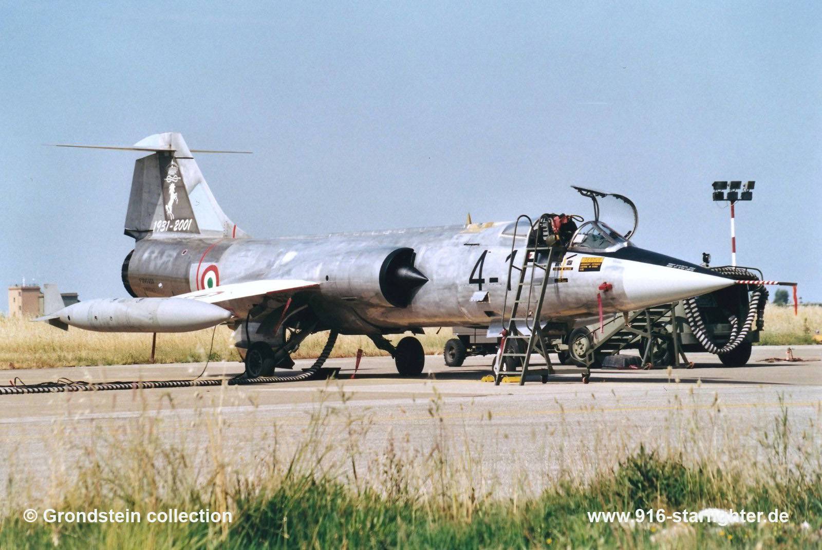 F-104S ASA 4-1 "1931-2001" at Pratica di Mare AB 2004 F-104S, construction number 783-1243, serial number MM6943, model 783, built by Alenia production line 8.9.1978; delivery date AMI 30.11.1978; delivery date 155°Gruppo 8.1.1979, 51-53 03.1979-25.6.1983 stored Istrana 25.6.1983-9.9.1984; IRAN 9.9.1984-05.1985; 311°Gruppo 05.1986-8.1.1988 delivery date 21°Gr 8.1.1988; 53-16 8.1.1988-8.6.1989; IRAN + F-104S ASA conversion 8.6.1989-24.5.1991 delivery date 36°Stormo 12°Gruppo 24.5.1991, 36-20 15.6.1991-20.2.1995; delivery date 53°Stormo 21°Gruppo 20.2.1995, 53-05 03.1995-9.5.1995 IRAN 9.5.1995-28.5.1997; respray in grey camouflage scheme; delivery date 18°Gruppo 37°Stormo 4.6.1997, 37-15 06.1997-24.12.1997 at Leuchars St. Andrews Battle of Britain Airshow September 12, 1997; 18 Gruppo special marks "18" "Ocio che te copo" in WW II color scheme 14.9.1998-17.4.1999 delivery date 9°Gruppo of 4°Stormo 1.6.1999; 4-20 23.6.1999-14.9.2000; 4-1 4°Stormo Grosseto in special bare metal colors celebrating the 70th anniversary "70 anni" "1931-2001" of the unit April 27, 2001; special bare metal camouflage scheme 11.2000-4.3.2002 withdrawn from use Grosseto 10.2.2002 with 2.883 flight hours display Pratica di Mare AB May 2004, preserved in flight condition (used for engine-trials) 2003-2008 preserved in old AMI colorscheme (bare metal) inside the new Grosseto Base museum (old 20 Gruppo hangar) July 8, 2008 noted; August 2025 noted. copyright © Grondstein collection