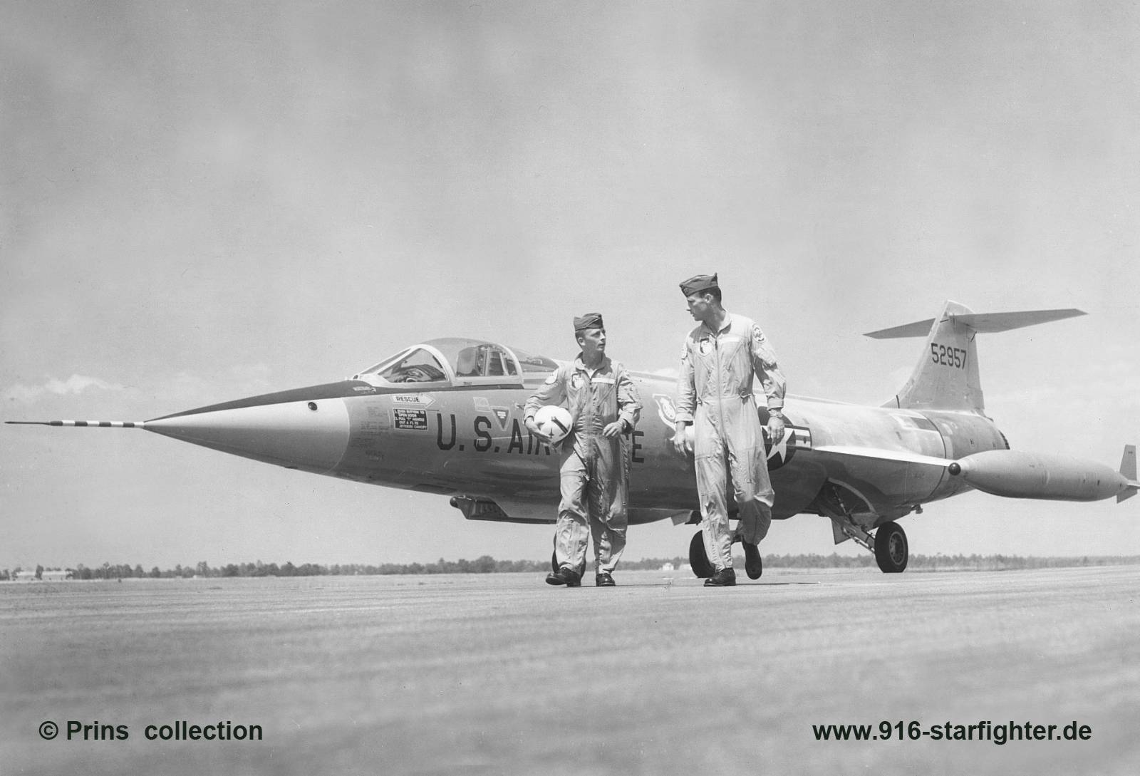 JQF-104A "52957" 3205th Drone Squadron in overall Day-Glo color scheme at Eglin AFB 1964 YF-104A, construction number 183-1003, model 183-93-02, US serial number 55-2957, built by Lockheed accepted by USAF on May 3, 1956; delivery date August 3, 1956; retained by manufacturer (Lockheed) and modified to JF-104A in 1958 aircraft was officially assigned to the 83 FIS (Fighter Intercepter Squadron) at Hamilton AFB, CA but had special equipment FG-957 set world altitude record of 27.813 m (91.246 ft) on May 7, 1958 by Major Howard Johnson of 83 FIS at Edwards AFB aircraft stayed as JF-104A until it was modified into a QF-104A at Palmdale in March 1961; on March 10, 1961 to AF Proving Ground Center (AF Systems Command), Eglin AFB, FL assigned to the 3205th Drone Squadron at Eglin AB, modified to JQF-104A at McClellan AFB, CA in January 1963 for specific testing and optimizing the QF modifications this testing ended in the summer of 1965; modified back to standard QF-104A in July 1965 with 3205 Drone Squadron (QFG-957); flying unmanned missions until mid-1967 mentioned is a "dog fight" mission against a F-4D on July 19, 1967; shot down August 8, 1967 serialled as "QFG-957", no information available about where it was shotdown and how It was on its 4th drone flight. This Starfighter became famous when Howard C Johnson broke the record (91.243 feet) on 7 March 1958. The aircraft was officially assigned to 83 FIS at Hamilton AB but had special equipment being a JF-104A. November 13, 1958: Swiss altitude record of 21,600 meters (70,866 feet) in a zoom climb by Hptm Arthur Moll, Swiss Air Force, in YF-104A "FG-957", serial number 55-2957 at Edwards AFB, CA. copyright © Harry Prins collection