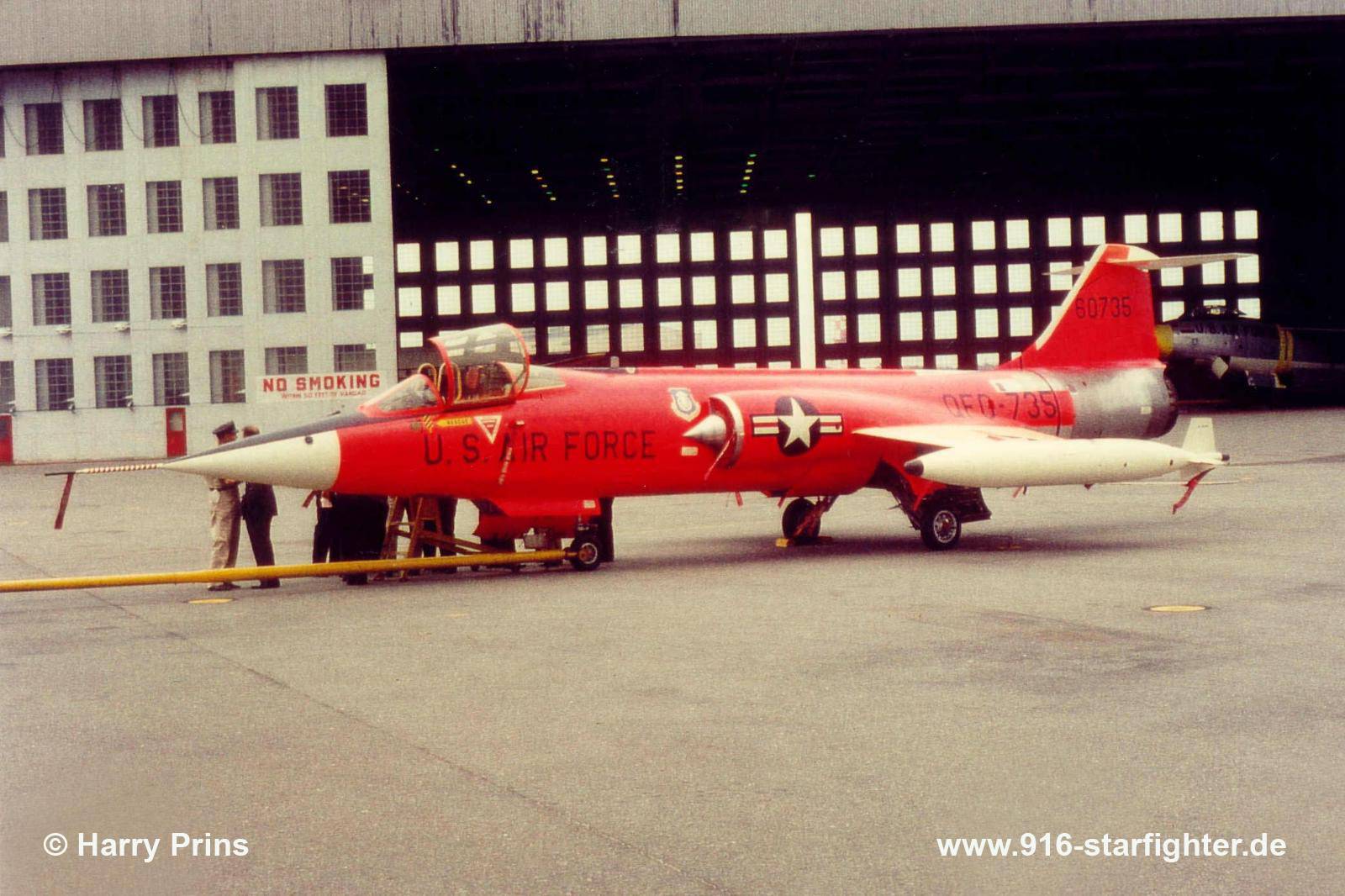 QF-104A "QFG-735" 3205th Drone Squadron in overall Day-Glo color scheme 1962 F-104A, construction number 183-1023, model 183-93-02, US serial number 56-0735, built by Lockheed accepted by USAF January 31, 1957 and retained by manufacturer; in March 1957 modified to JF-104A; to Edwards AFB under ARDC for flight testing in 1959 it was officially transferred to the AFFTC and got a G-tail for testing G-airframe stuff in 1960 it continued its test program until 1961 when it went to Palmdale for conversion towards a QF-104A September 18, 1961 converted to JQF-104A coded "QFG-735"; July 1962 to 3201 Maintenance Group (AFSC), Eglin AFB, FL painted Day-Glo with 3205 DS (Drone Squadron) Eglin AFB, FL 1963 barrier engagement on May 9, 1963 with broken nose gear, after repair painted white with 3205 DS Eglin AFB July 1964 (AFSC badge) September 2, 1964 barrier engagement on landing; shot down June 17, 1965 with AIM-7 by F-4 of USN, 11 drone flights. copyright © Harry Prins