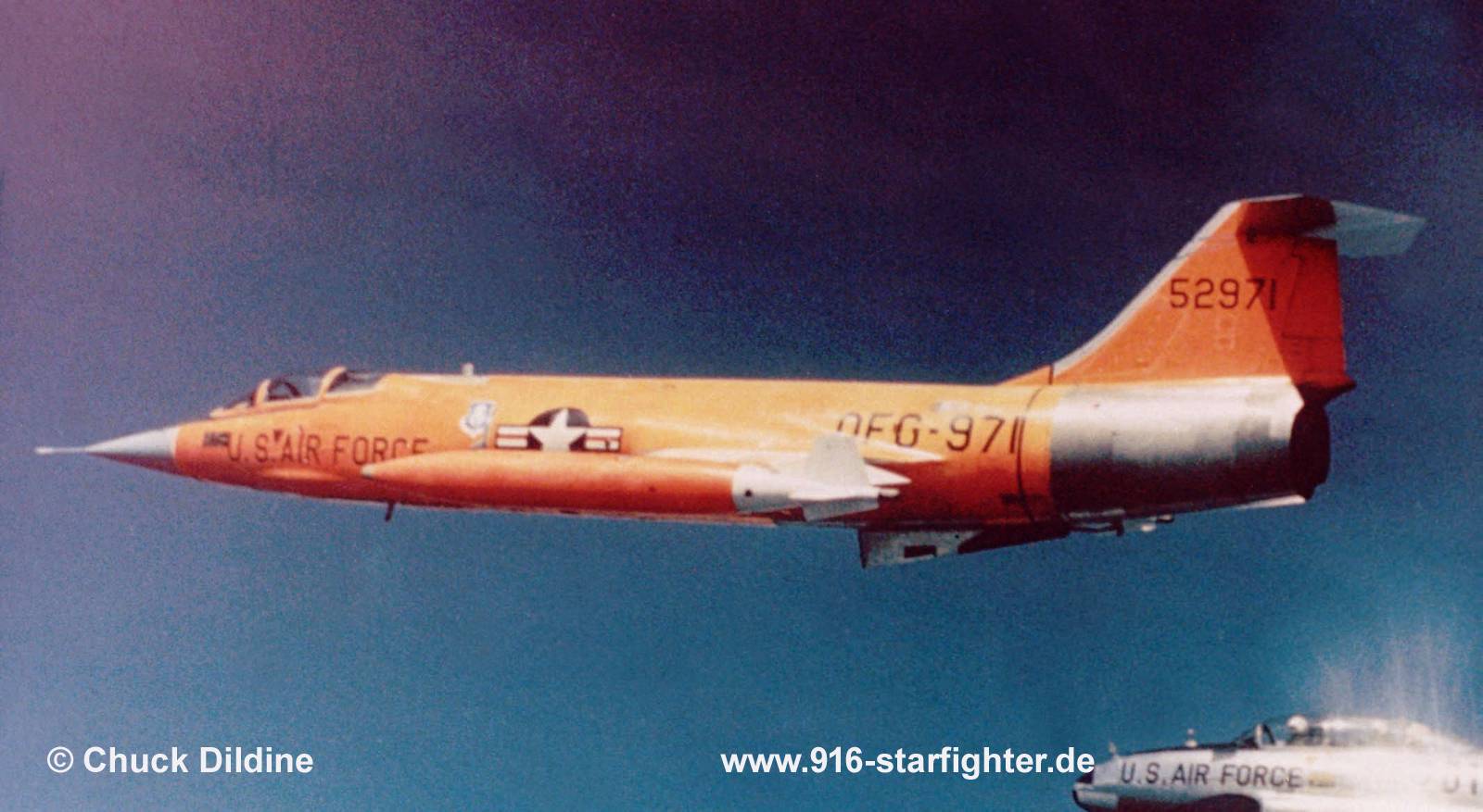 JQF-104A "QFG-971" 3205th Drone Squadron in overall Day-Glo color scheme The QF-104A was a special modified version of the (Y)F-104A Starfighter which could be flown remotely controlled. The control was done by F-104 pilots on the ground or inside another aircraft. The conversion of the (Y)F-104A to QF-104A was approved on February 19, 1960 by the USAF. Testing of the QF was conducted during the period of January 9, 1961 to October 16, 1961. The reason for converting the (Y)F-104A was the need for high altitude, high speed targets for the development of ground-to-air (BOMARC) and Air-to-Air (AIM-7-AIM 9-GAR 2B-MB 1-AIM 4) missiles. The first unmanned mission was flown on October 17, 1961 being probably QF-104A "55-2957". There are conflicting numbers on the total QF-104A's manufactured. Lockheed says 24, Chuck Dildine's records show 22 that were delivered to the USAF. 20 of them were actually killed as targets and one crashed during a test flight (pilot ejected safely). Most QF-104 missions were flown at Eglin AFB, Florida. However, some were flown at Holloman AFB in New Mexico and a small number at Point Magu NAS, California (US NAVY). copyright © Chuck Dildine