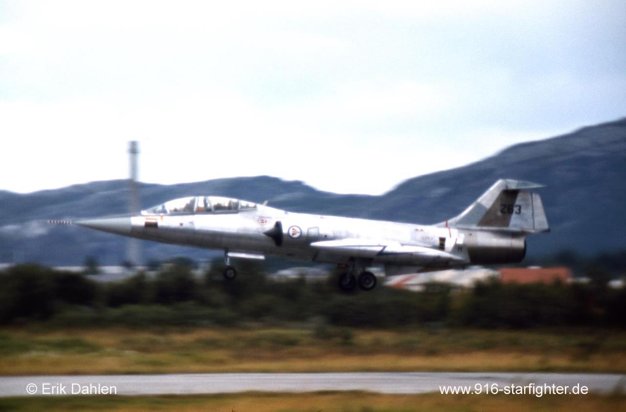 TF-104G "263" 331 squadron RNoAF landing at Bodo AB 1972 TF-104G, construction number 583C-5508, model 583-10-20, US serial number 62-12263, built by LockheedMAP to Norway September 6, 1963 coded "FN-M" with 15 flight hours coded "263" with 331 Skv at Bodo AB in September 1975 returned coded "263" to USAF with 3.179 flight hours on July 8, 1981