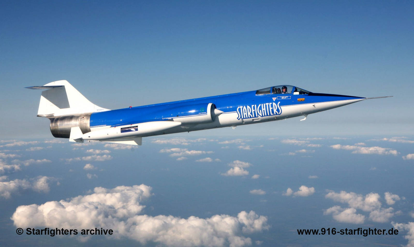 CF-104 N104RD "Starfighters" wing formation CF-104, construction number 1150, serial number 104850, built by Canadair CF-104 "N104RD" Build for the Canadian Armed Forces this Starfighter was received on August 20, 1963 coded as 12850 and flew with the Canadians until May 23, 1973. To Norwegian Air Force on November 19, 1973 with 1.921 flight hours coded as "850". After its Norwegian career the aircraft was withdrawn from use on December 6, 1982 with 3.482 flight hours and stored at Sola AB. Transferred to the Norwegian AF museum which exchanged the aircraft for a Harvard aircraft. The new owner became Steve Alex, Maine USA. He wanted to make the aircraft fly worthy again and registered the aircraft N104JT for "Jet Tech systems" which was a company owned by him. The project stopped due to circumstances and the aircraft was sold to Rick Svetkoff. He brought it over to St Petersburg in July 1997. That same month the aircraft had its first engine runs and on October 30, 1997 it made its first "civil" flight. It was still bare metal with a white tail. Late 1997 to early 1998 it received its bright blue-white color scheme. In early 1999 the aircraft received a new registration "N104RD". The aircraft was always flown by the late Tom "Sharkbait" Delashaw. copyright © "Starfighters" archive