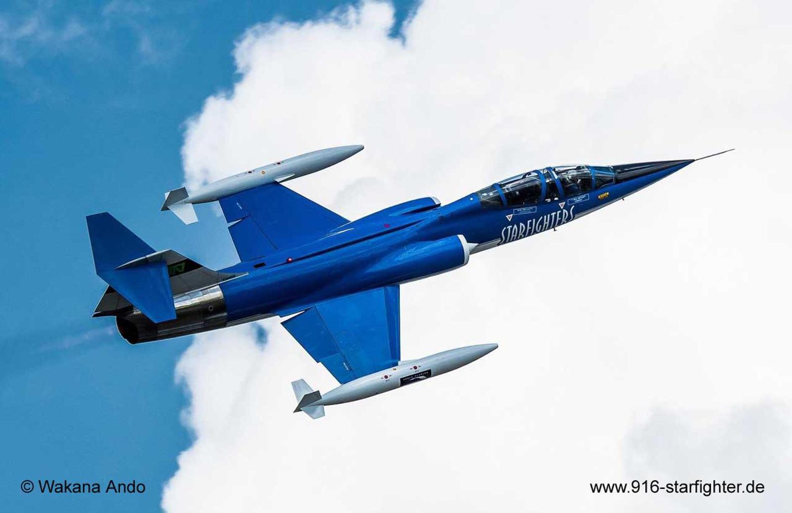 CF-104D N104RB "Starfighters" showing top view 2015 CF-104D, construction number 5302, serial number 104632, built by Canadair CF-104 "N104RB" Build for the Canadian Armed Forces this Starfighter was received on May 1, 1962 and flew with the Canadians until May 23, 1973. Sold to Norway April 14, 1973 it was taken into service by the Norwegian Air Force as CF-104D 4632 on September 14, 1973. Withdrawn from service on November 19, 1982 and stored at Flesland AB, Norway. The aircraft was sold to the company Northern Light in the USA in 1988. In 1988 it was seen in the USA still wearing the green Norwegian colors but already wearing the new civil registration "N104NL" (Northern Light). The aircraft was polished to bare metal and made its first civil flight on May 16, 1989 at Mojave Apt. Soon after the aircraft received its famous light blue-overall Northern Light colors. In June 1993 it was grounded (FAA) and put for sale. In 1994 it was sold to Thunderbird Aviation, Deer Valley which used the aircraft later on for specific contract work (US Navy included). The aircraft received a new registration "N166TB" (Thunder Bird) and was painted blue grey/white. After a while Thunderbird Aviation was willing to sell the aircraft and by that time it was bought by Rick Svetkoff (January 1996) for his planned Starfighter demonstration team. At that moment the aircraft was not fly worthy and was brought over to St Petersburg where it arrived in February 1996. In October 1996 the first taxi-runs were executed and soon after the aircraft was flown again. The first flight was made from Montgomery Alabama. Late 1997/early 1998 the aircraft received its bright blue-white STARFIGHTERS color scheme. The N166TB registration was changed into "N104RB" in November 1997, not to remember the famous "Red Baron" Starfighter but just to have 104 again in the registration together with the initials of Rick and his wife Brenda. Rick Svetkoff was flying this two-seater during the demonstrations. Grounded due to missing parts; latest status unknown. copyright © Wakana Ando