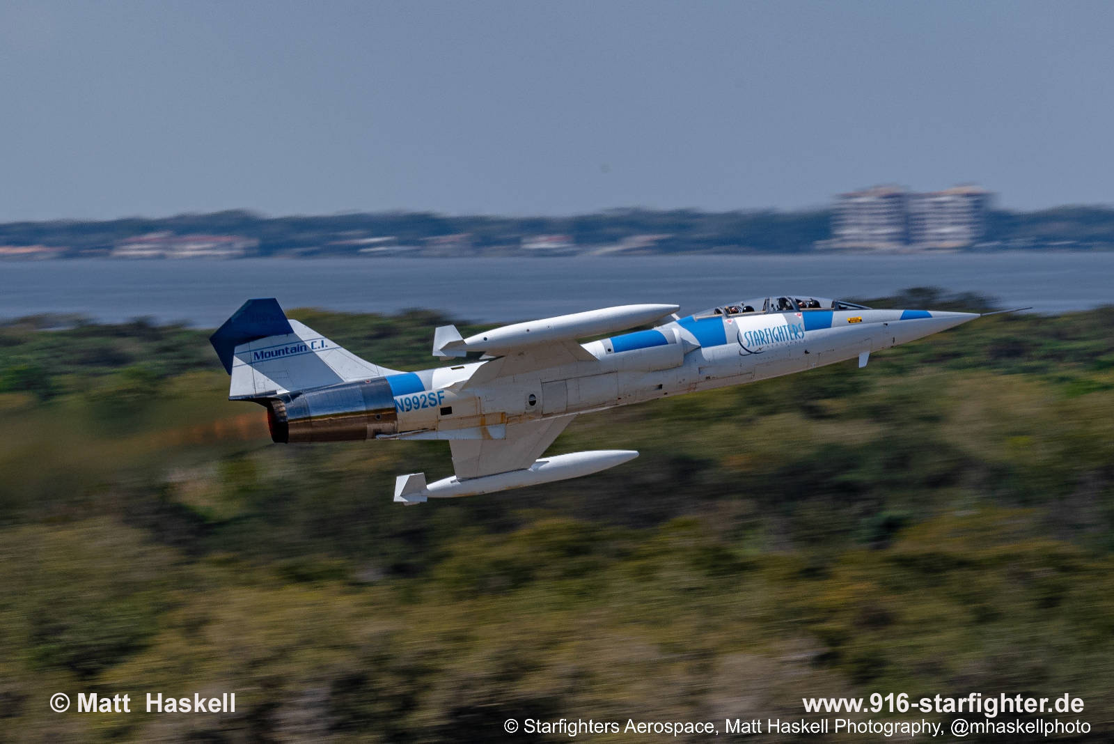 TF-104G-M "N992SF" "Starfighters" departing the Kennedy Space Center "Starfighters" the only fully operational, civilian owned Supersonic Jet Team Rick "Comrade" Svetkoff - Pilot Rick's career in aviation began in 1971 flying air charter, corporate and commuter flights. 1978 found him opening new doors and flying A-4s, carrier based attack fighters, for the United States Navy. After leaving the Navy in 1984, Rick joined Continental Airlines where he is now a captain of the 757/767. Rick adds to his 26 year, 20,000 hour flying career with his participation in the air show industry. For the past five years, he has been a part of the air show circuit and has cultivated his dream of assembling an F-104 team. Rick is the owner and chief pilot for the "Starfighters" F-104 team. copyright © Matt Haskell