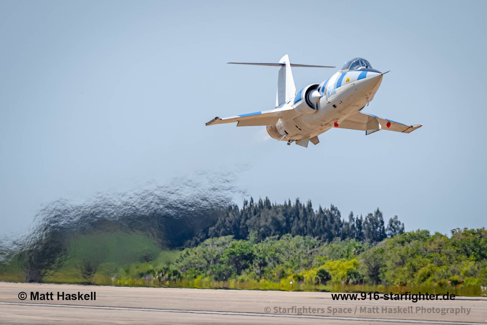 F-104S.ASA-M "N993SF" "Starfighters" after take-off MM6734 1034 construction number 783-1034, serial number MM6734, model 783 On April 28, 2023 the Starfighters Aerospace F-104S.ASA-M N993SF made its first flight from Cape Canaveral after many years of preparation. It arrived in the USA as ex Italian MM6734 in 2011 and in 2014 it was seen for the first time wearing the company blue grey splinter camouflage scheme. Great to see the aircraft making its first flight now and this happened to be flawless. After around 16 minutes air time pilot Piercarlo Ciacchi landed again with a smile on his face. copyright © Matt Haskell