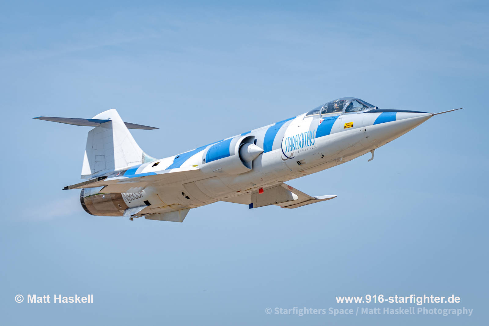 F-104S.ASA-M "N993SF" "Starfighters" low view MM6734 1034 construction number 783-1034, serial number MM6734, model 783 Starfighters operates the world’s only fleet of flight-ready F-104 supersonic aircraft. Based at NASA's Kennedy Space Center and operating under authorization from the Federal Aviation Administration, these aircraft are available to government and commercial customers for a variety of missions. The Italian-made F-104S is the most capable model, able to achieve sustained speeds of MACH 2.2 in both level and climbing flight profiles, and altitudes in excess of 100,000 feet. copyright © Matt Haskell