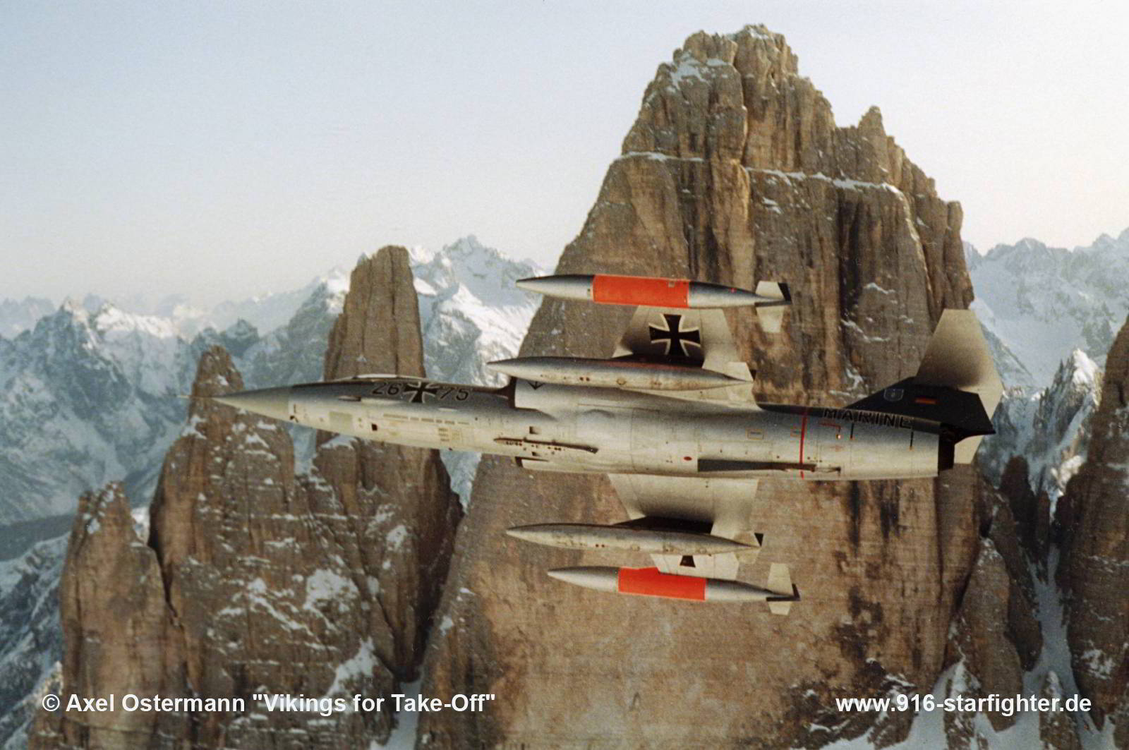 F-104G "26+75" of MFG 2 passing along the "Drei Zinnen" (3 peaks) in the Alps All pictures are from the book: "Vikings for Take Off" Picture taken by Axel Ostermann on flights around Europe I am very grateful that I can show all these wonderful pictures on my website and keep those moments alive for decades to come