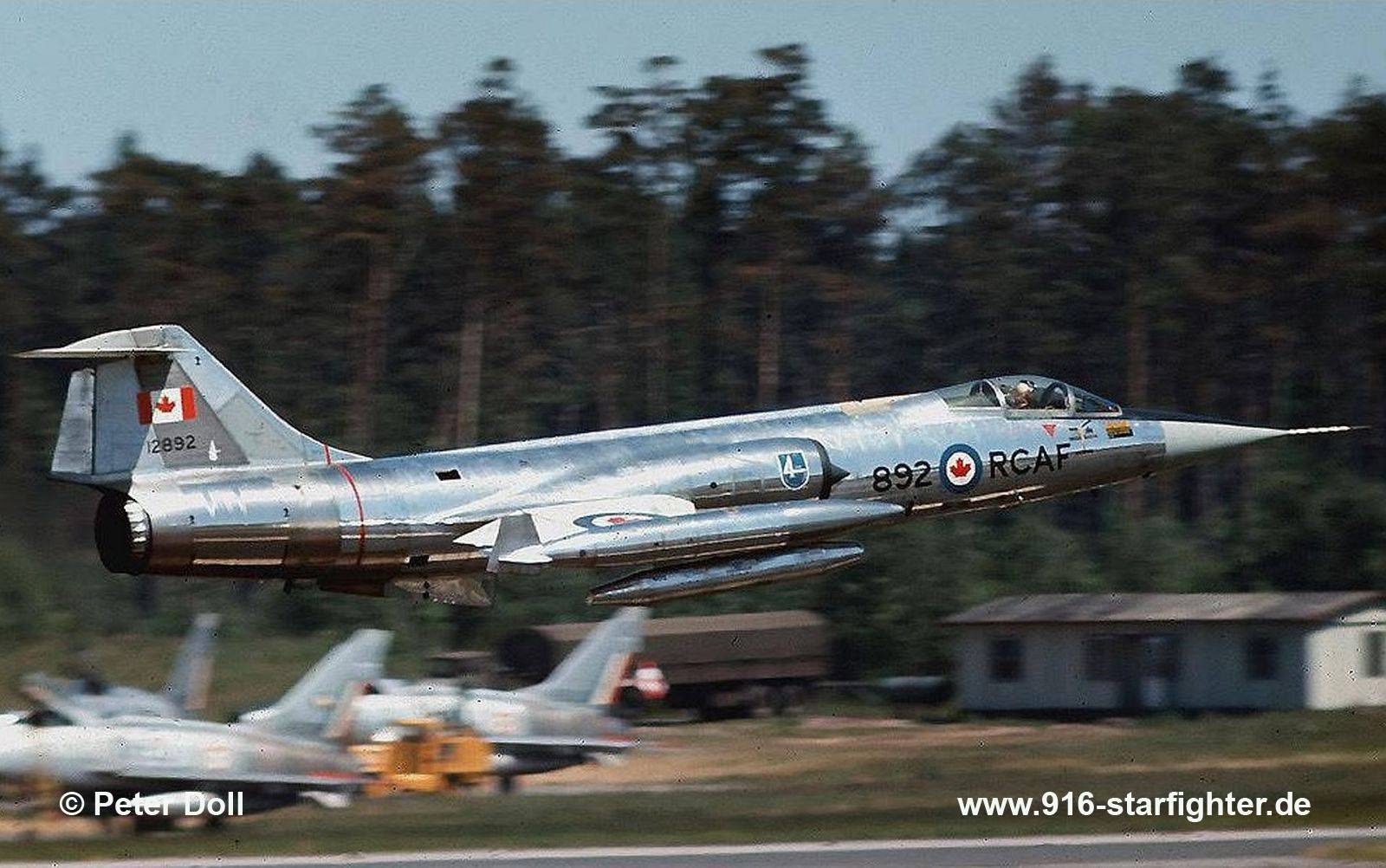 CF-104 "892" RCAF of the 4 ATAF team during Tactical Weapons Meet 1968 (TWM68) at Jever AB June 1968 CF-104, Canadair Model CL-90, Lockheed Model 683-04-12, Canadair construction number 683A-1192, RCAF serial number 12892, built by Canadairfirst flight June 14, 1963; delivery date August 7, 1963 after 6 flights with 10:25 flight hours; first unit 2 Wing of 1 Air Division (1 AD) August 7, 1963; February 6, 1964 to 3 Wing noted at 7.AirTac (TWM) at Jever AB in June 1968; January 14, 1969 to Sollingen; reserialed as 104892 effective June 1970; June 10, 1975 cannon installation and wing rework return to Sollingen; November 28, 1977 to SAL for variegated painting; it was last noted at CFB Baden-Sollingen with 1 Canadian Air Group early 1978; December 5, 1978 to NWI for DILR transferred to Cold Lake; 1979 operated by the 417 squadron at Cold Lake crashed (with 417 ST/R [OT] Squadron, CAF) June 4, 1982 at Jimmy Lake Range, Alberta after in-flight fire due to improper maintenance; pilot Capt K.G. Cranfield ejected safely Lockheed C-2 seat, written off; June 15, 1983 struck off charge; tail section reported at CFB Cold Lake fire dump in June 1994; no further information Capt Cranfield also ejected from 104762. copyright © Peter Doll