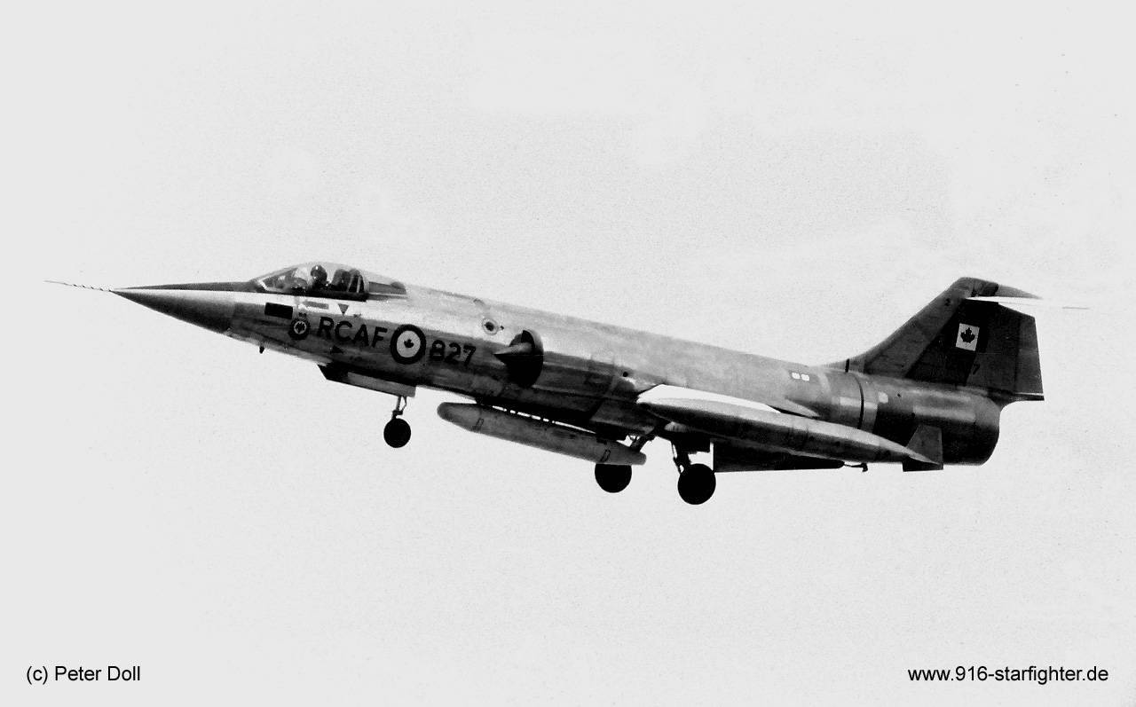 CF-104 "827" landing at Sollingen 1965 with a MN-1A practice bomb dispenser CF-104, Canadair model CL-90, Lockheed model 683-04-12, Canadair construction number 683A-1127, RCAF serial number 12827, built by Canadairfirst flight August 30, 1962; delivery date March 8, 1963; first unit 1 Air Division (1 AD) RCAF; reserialed as 104827 effective June 1970 at Tiger meet 1973 at Cameri AB, Italy crashed after a midair collision with a Piper Tri-Pacer (D-????) near Baden, Germany on July 29, 1982 while on a training mission. It was assigned to 1 CAG and flown by 439 Squadron that day, the pilot Col. Jack L. Frazer was the Base Commander at CFB Baden-Sollingen, he ejected successfully, struck off service on December 15, 1982 The other airplane was a civil Cessna sport plane, also crashed killing both 2 persons inside. On the ground also 1 person was killed. The CF104-pilot, Col. Jack L. Frazer used his ejection seat successfully. Both aircraft came down on fire. My second ejection was on July 29, 1982 from CF104 12827. A civilian light aircraft collided with me head on with me taking his left wing and tail plane off and his wing taking one and a half feet of my left wing off. My aircraft began rolling out of control and I ejected just past the inverted position at about 700 feet above ground - a good system and a large depression in the ground under my ejection point saved my life. Unhappily, my aircraft impacted a house on the ground, killing the 19 year old occupant and both people in the other aircraft were killed. In the collision, my left hand became jammed on the throttle and my elbow was turned "inside out" when the seat rose up the rails. Since the ejection was at over 500 MPH I suffered some other damage as well but all in all was very fortunate. Jack Frazer copyright © Peter Doll