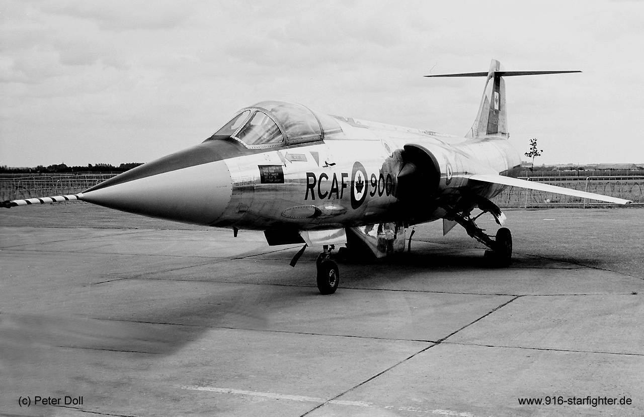 CF-104 "900" clean with Vinten VICON under-fuselage camera pod CF-104, Canadair model CL-90, Lockheed model 683-04-12, Canadair construction number 683A-1200, RCAF serial number 12900, built by Canadairfirst flight September 4, 1963; delivery date January 10, 1964; first unit 1 Air Division (AD) in Europe August 1969 at Tiger Meet at Woodbridge, UK with 1 Wing badge; reserialed as 104900 effective June 1970