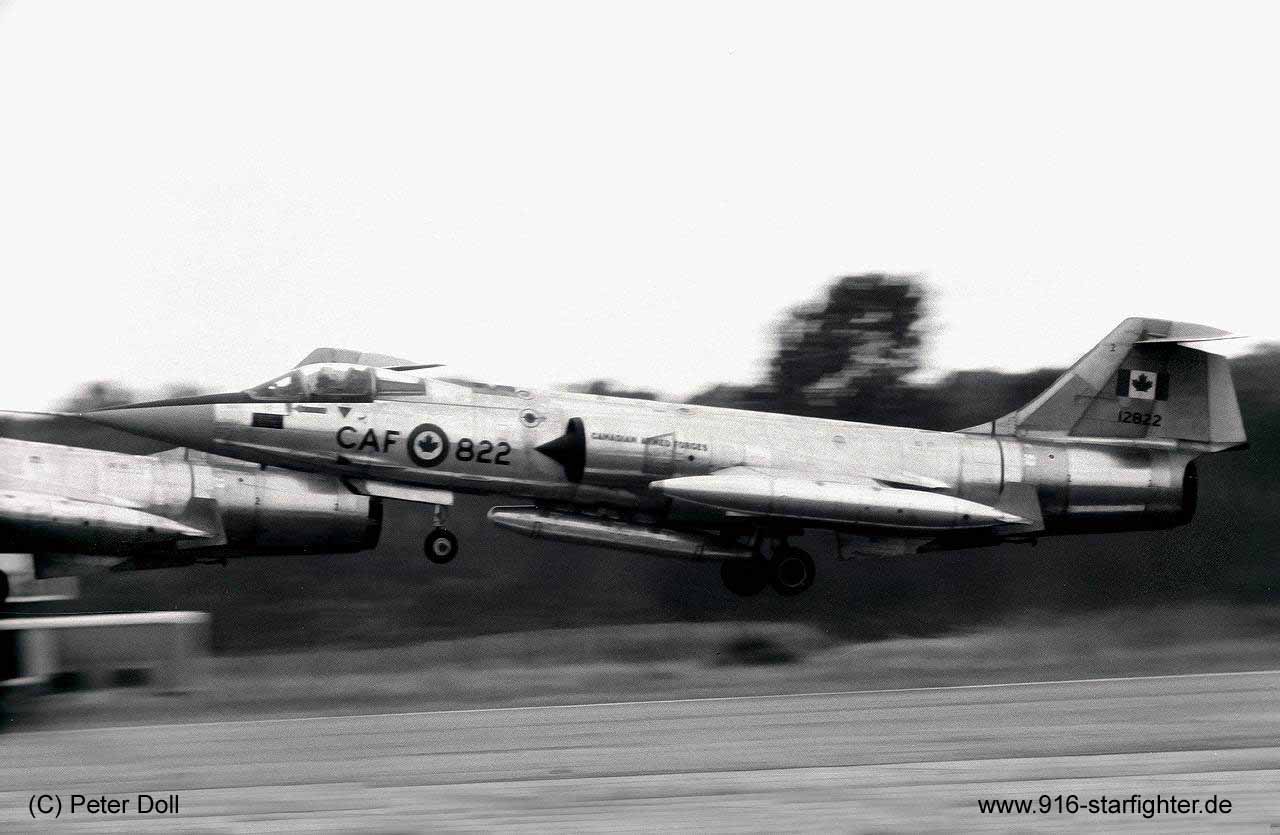 CF-104 "822" of 1 Canadian Air Group (1 CAG) at CAFB Sollingen 1970 CF-104, Canadair model CL-90, Lockheed model 683-04-12, Canadair construction number 683A-1122, RCAF serial number 12822, built by Canadairfirst flight August 17, 1962; delivery date to RCAF coded 12822 on February 15, 1963; first unit 1 Air Division (AD) reserialed as 104822 effective June 1970; "Whisky Four" aerobatic team Aviano Open Day July 1981, officially withdrawn from use in April 1984 stored at CFB Baden-Sollingen (date unknown); to training aid coded "848C" on May 13, 1985; to ABDR training aid (number unknown) last noted was somewhere in 1990 when it was seen BDRT aircraft coded "848C"; to controlled cannibalization (date unknown) current status unknown, likely it went to a local scrap dealer. copyright © Peter Doll
