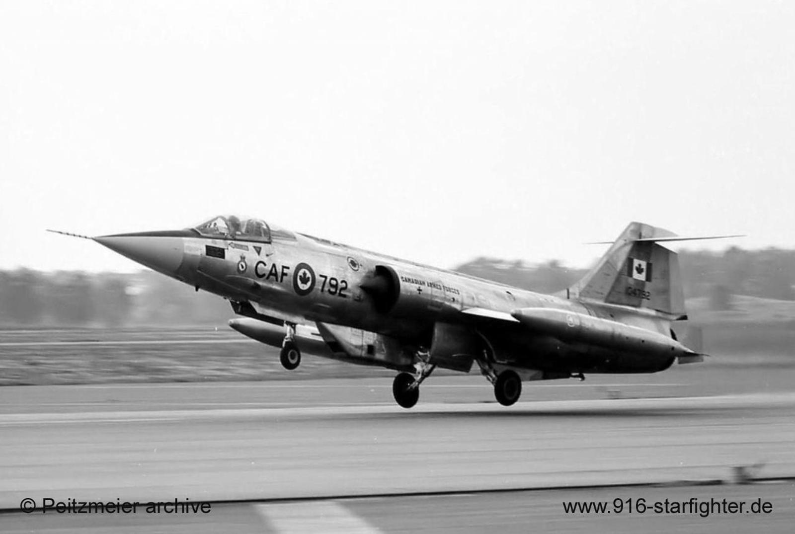 CF-104 "792" of 1 Canadian Air Group (1 CAG) at Royal Flush 70 at Deelen AB, NL CF-104, Canadair model CL-90, Lockheed model 683-04-12, Canadair construction number 683A-1092, RCAF serial number 12792, built by Canadairfirst flight May 10, 1962; delivery date October 14, 1962 after 17 flights with 24 flight hours; first CF-104 to Europe with 3 Wing, Marville on October 14, 1962; 1969 with 1 Wing, Lahr reserialed as 104792 effective June 1970; May 6, 1974 to AETE at Cold Lake; 1975 to 417 OTU; had the formation lighting strips tests in 1978 it was also the only overall green Starfighter used first by the AETE (Aerospace Engineering Test Establishment) and then 417 Squadron and it was the trials aircraft for the "electro-luminescent strip lighting"; withdrawn from use 1982 with 4.439 flying hours; struck of charge January 16, 1990; storage CFB Mountainview instructional BDRT airframe coded "A794" at CFB Borden with Canadian Forces School of Aerospace & Ordnance Engineering 1983 preserved on pole at Canadian Forces Base Borden, Ontario in May 1990; September 4, 2004 noted; has been refurbished and put back on the pole again July 2008 serials look a bit different now than before; August 4, 2011 noted; May 2018 noted; July 2023 noted.