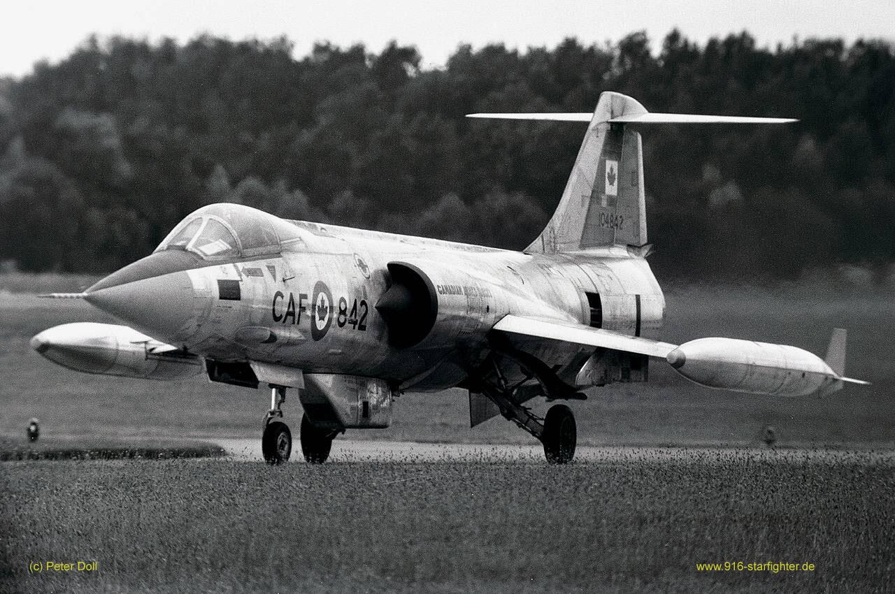 CF-104 "842" 441 (Silver Fox) Squadron of 1 Canadian Air Group (1 CAG) with the Vinten VICON under-fuselage camera pod at CFB Sollingen CF-104, Canadair model CL-90, Lockheed model 683-04-12, Canadair construction number 683A-1142, RCAF serial number 12842, built by Canadairtaken on service by RCAF as 12842 on March 12, 1963; delivered from factory to Europe 1st Air Division; reserialed as 104842 effective June 1970 CF-104 nosewheel collapsed upon landing after a test flight at Scottish Aviation, Prestwick February 25, 1976 and was repaired special marks maple leaf tail TAM1978 "104842/C" at RAF Wildenrath, Germany June 1978; struck of charge on April 8, 1986