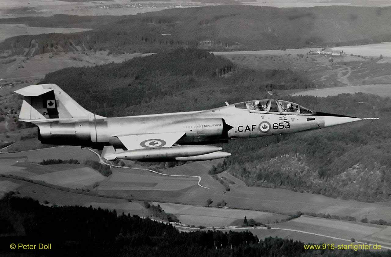 CF-104D "653" of 1 Canadian Air Group (1 CAG) at CFB Sollingen on Low Level training flight over Germany CF-104D, Lockheed model 583-04-15, Lockheed construction number 583A-5323, RCAF serial number 12653, Mk 2 (Dual Operational Aircraft), built by Lockheedtaken on service by RCAF as 12653 on November 3, 1964; March 1, 1965 to first unit 1 Air Division (Europe) for 439 squadron reserialed as 104653 effective June 1970; many years operated be 439 squadron withdrawn from use in 1983; to controlled cannibalization (CFB Baden-Sollingen) on June 17, 1983 coded "822C" BDRT airframe December 20, 1983; scrapped. copyright © Peter Doll