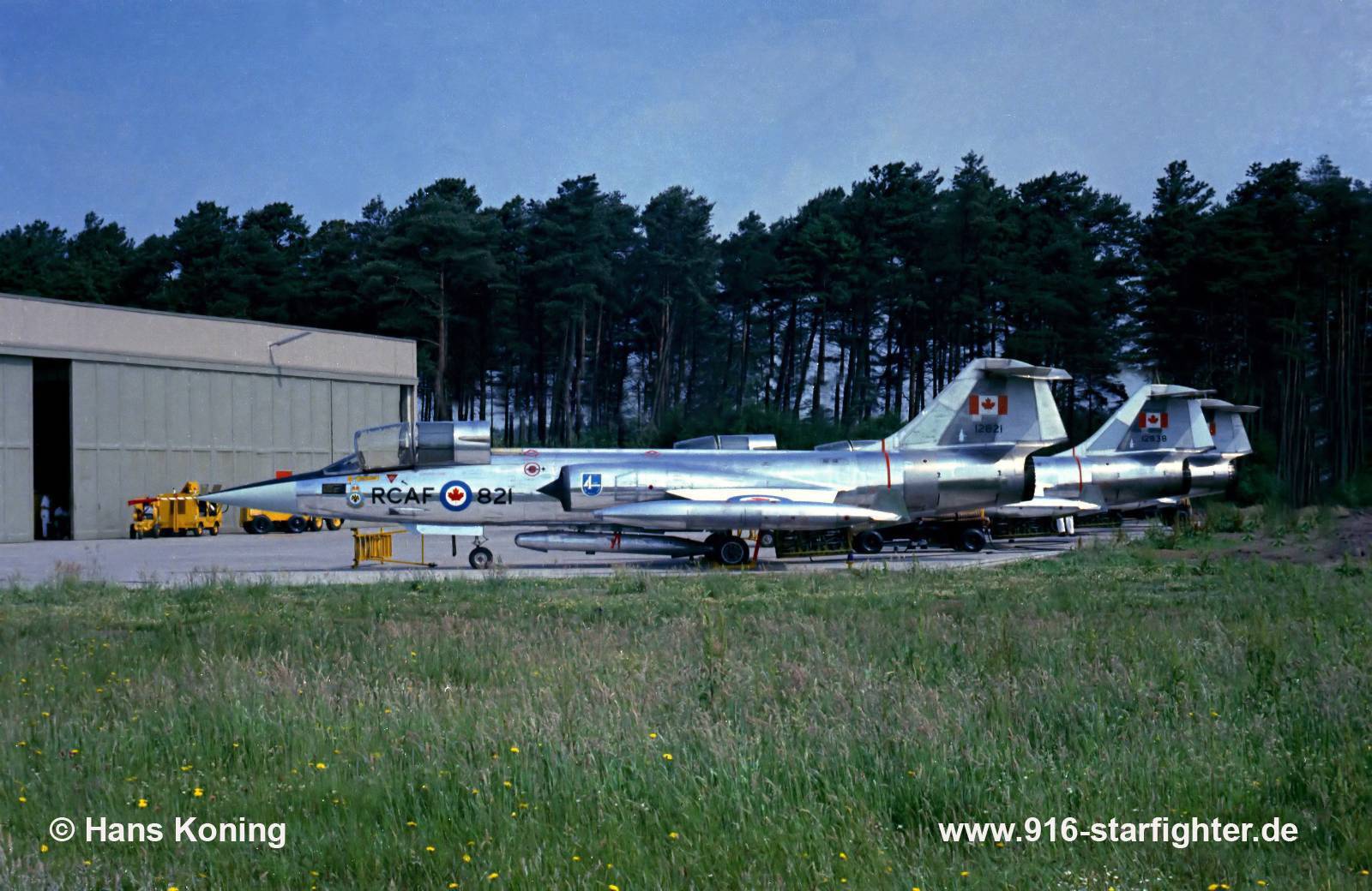 CF-104 "821" Canadian Armed Forces team of 4 ATAF at Tactical Weapon Meet at Jever AB in June 1968 CF-104, Canadair model CL-90, Lockheed model 683-04-12, Canadair construction number 683A-1121, RCAF serial number 12821, built by Canadairdelivery date to RCAF coded 12821 on October 2, 1962 for 3 Wing of 1 AD in Europe; reserialed as 104821 effective June 1970 April 19, 1971 to Prestwick for incident repair; December 6, 1971 back to Sollingen; August 1, 1974 to SAL for cannon installation June 10, 1975 to SAL for IRAN; December 6, 1978 to NWI for DLIR; return to Sollingen crashed with 439 sqn of 1 CAG from CFB Sollingen on January 10, 1983 after engine failure due to foreign object damage (FOD), pilot ejected safely; struck of service on November 23, 1983. SAL: Scottish Aviation Limited, Prestwick, UK NMI: North West Industries, Edmonton DLIR: Depot Level Inspection and Repair copyright @ Hans Koning "Tactical Weapons Meet" was an exercise between teams of the Second Allied Tactical Air Force (2ATAF) and 4 ATAF. 2ATAF had teams from the Royal Netherlands Air Force, the Belgian Air Force, RAF Germany and the northern part of West Germany. 4ATAF consisted of teams of the southern part of West Germany, the Canadian Armed Forces and USAFE. In many years the French Air Force participated with a guest team. copyright © Hans Koning