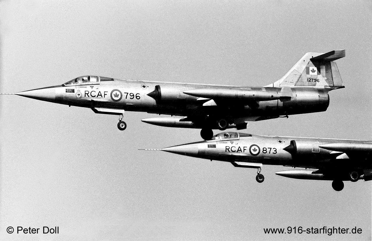 CF-104 "796" of 1 Air Division (1 AD) in Silver-finish colors at CFB Sollingen 1965 CF-104, Canadair model CL-90, Lockheed model 683-04-12, Canadair construction number 683A-1096, RCAF serial number 12796, built by Canadairfirst flight May 21, 1962, delivery date December 1, 1962 after 19 flights with 30:20 flight hours delivered to one of the wings in 1 Air Division; reserialed as 104796 effective June 2, 1970 1980 at Tactical Air Meet at Ramstein AB, wearing special markings on the wingtip tanks and a large white "D" on the tail in 1982, it was 439 Squadron's participant in the "Tiger Meet" at RAF Gutersloh It was withdrawn from use on February 14, 1986 and was given to Turkey