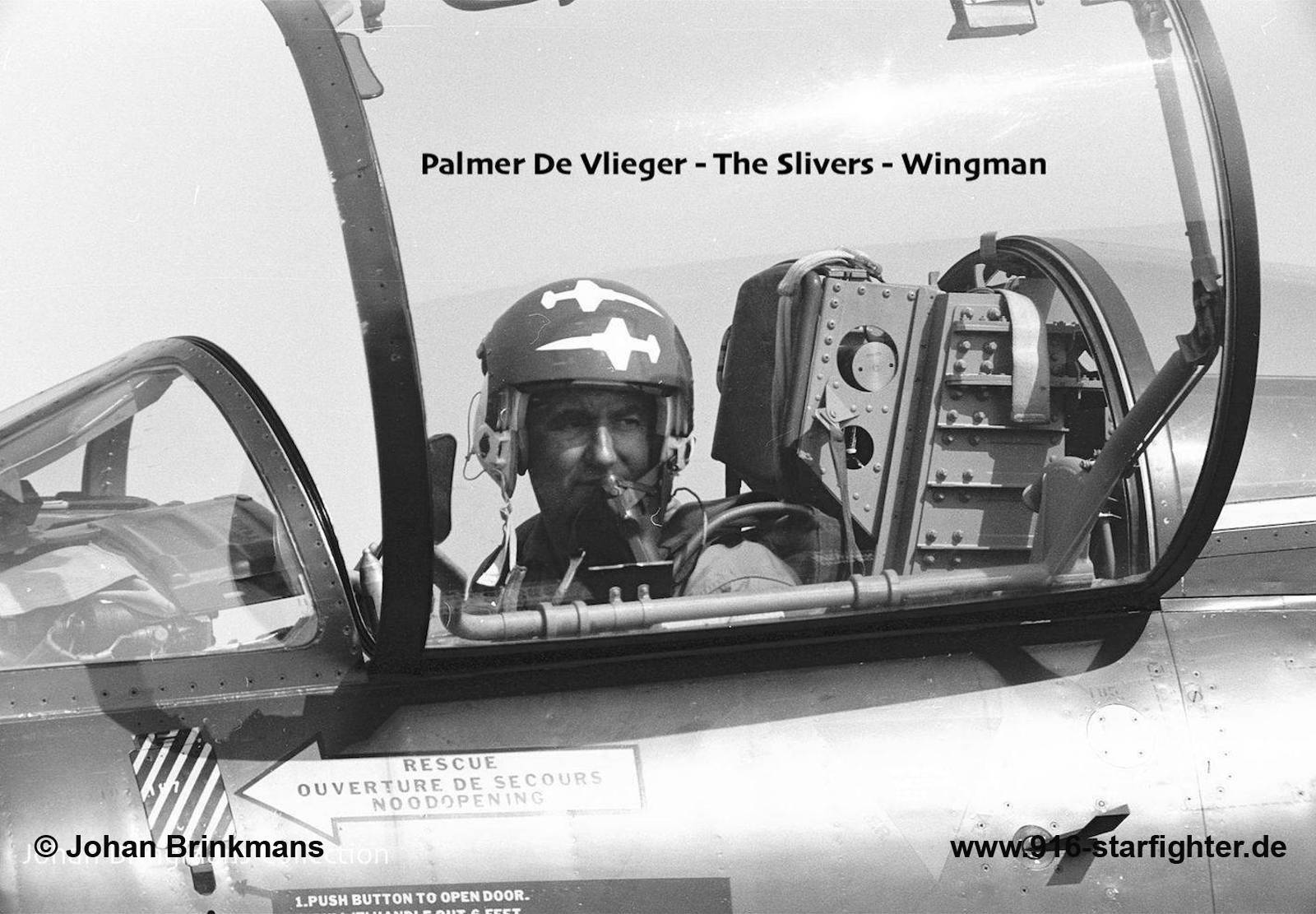 "Slivers" pilot Palmer De Vlieger Adjudant Chef Palmer De Vlieger was one of the two display pilots for The Belgium Air Force F -104 display team. The Slivers. The Display team gave their first public demonstration on May 14, 1969 during the international meeting at Brustem. Their show was based on synchronised high speed crossings with the runway axis as a reference point. The aircraft were painted in the traditonal 'Vietnam' camouflage - 2 tones of green, tan and grey on the underside. In these first years the planes wore an insigna on the air intakes depicting 2 silhouettes of a F-104 crossing on a red disc. This insigna disappeared to be replaced by the teams name from the 1972 season on. The Slivers disbanded in July 1975 as Major Steve Nuyts was called upon other duties and there were no candidates to replace him. This during the seven years the team made 68 official presentations, and displayed in 5 European countries - Belgium, United Kingdom, Germany, France and Italy. copyright © Johan Brinkmans