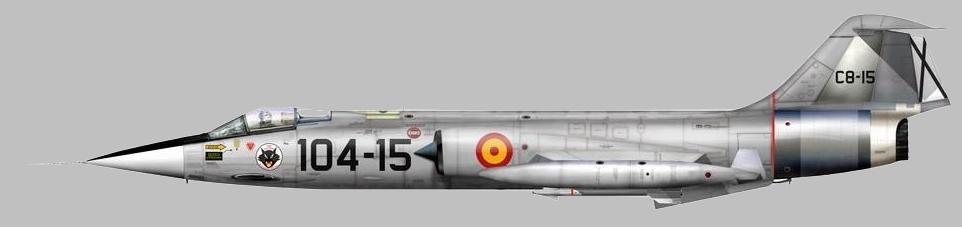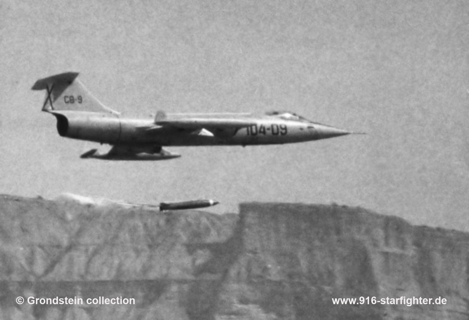 F-104G "104-09" (serial number 63-12716) 104 Escuadrón 1969, delivering a Matra "MK-82" retarded bomb F-104G, construction number 683D-6089, model 683-10-19, US serial number 63-13640, Spanish serial number C.8-9, built by Canadairfirst flight at Canadair November 17, 1964; delivery date January 25, 1965 to USAF; Spanish serial number C.8-9; MAP to Spain on June 6, 1965 by ship to Rota NAS coded FG-640/33640 to 161 Escuadrón at Torrejon AB on July 8, 1965 with 14 flight hours; coded 161-19 in 1965; 1967 coded 104-19 with renamed 104 Escuadrón coded 104-09 with 104 Escuadrón 1968; transferred to 122 Escuadrón on May 31, 1971; withdrawn from use on May 31, 1972 with 601 flight hours; returned to USAF May 31, 1972