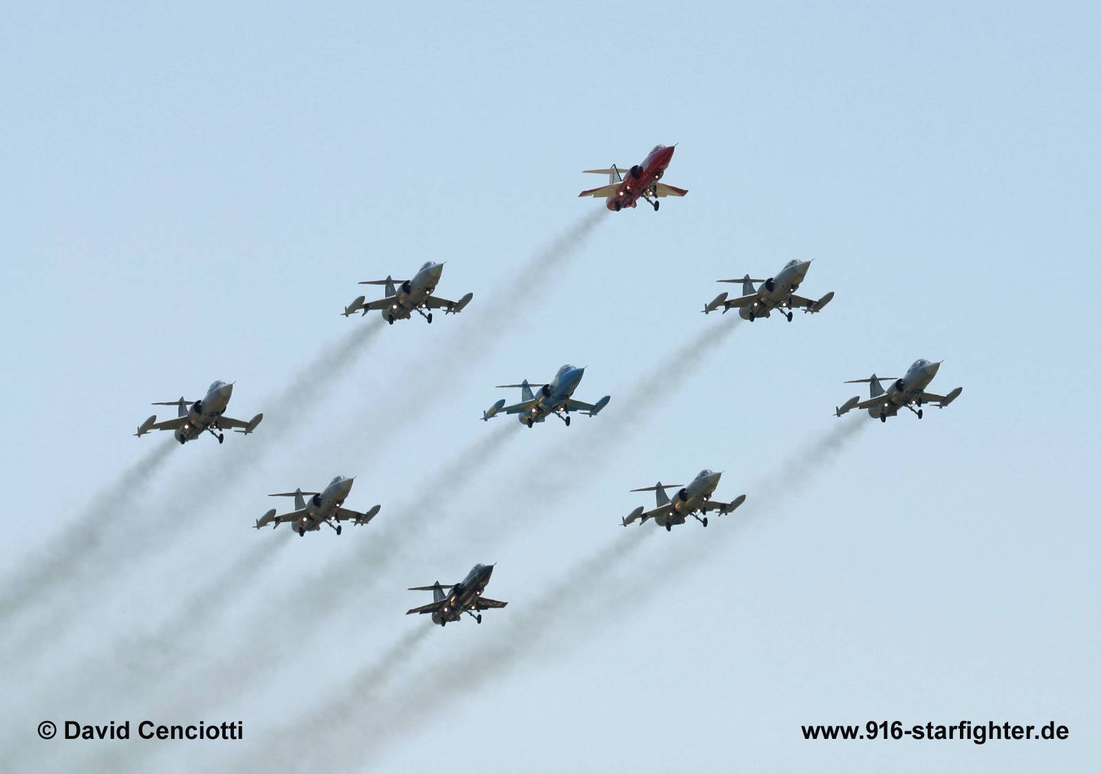 Last F-104 formation at Pratica di Mare during the F-104 farewell 2004 On May 30, 2004, Pratica di Mare hosted the official celebrations for the 50th Anniversary of the first flight of the Starfighter. More than 300,000 spectators attended the airshow of the International F-104 Meeting to which, the Aeronautica Militare, had invited all the pilots and ground crews belonging to the 15 nations that had been equipped with the Starfighter. The last ever flight of 9 F-104 (6 single seater and 3 two seater) that performed two fly-bys: the first in clean configuration, the second with the gear-down. Then they split up into three separate sections and entered the visual pattern to land in close sequence. copyright © David Cenciotti