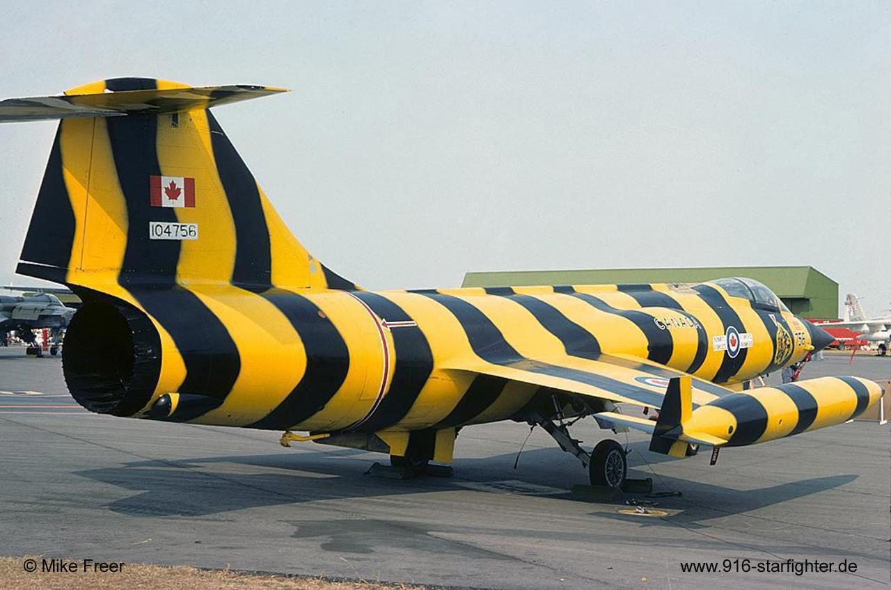 CF-104 "756" CAF 439 squadron "Tiger Meet" color scheme at Upper Heyford 1976 CF-104, serial number 12756 Canadair Model CL-90, Lockheed Model 683-04-12, Canadair construction number 683A-1056, built by Canadair first flight March 10, 1962 and received by the RCAF on May 5, 1962. It was assigned first to 6 ST/R OTU at RCAF Station Cold Lake, although in 1969 it went to 1 Air Division in Europe; reserialed as 104759 effective June 1970 it was 439 Squadron's specially painted aircraft for the 1976 "Tiger Meet" that the squadron hosted at CFB Baden-Sollingen in 1976 it was struck off service on March 21, 1986 and was given to TurkeyIt was taken on service by the Turkish AF (THK) as "62-756" on April 9, 1986 and served as "8-756" with 8.AJU until April 1994 preserved at Cayagzi (Riva); 27 km N of Istanbul in June 2011 noted; May 2022 noted; removed in 2023.