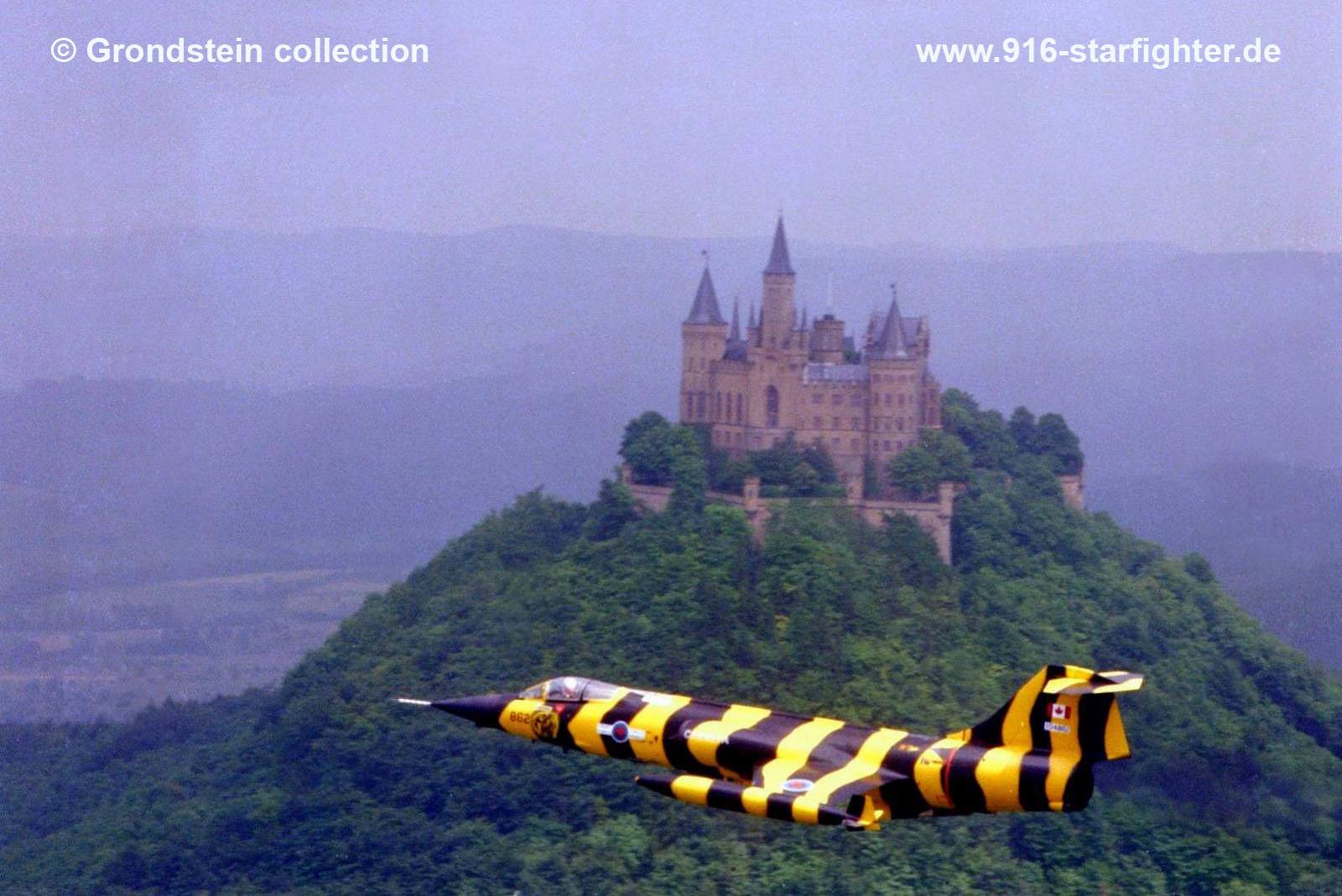 CF-104 "862" CAF 439 squadron "Tiger" from CFB Baden-Sollingen passing Hohenzollern castle 1979 CF-104, construction number 1162, serial number 12862, built by Canadair first flight 12, December 1962, taken on service by RCAF as 12862 on January 13, 1964; first unit 1 Air Division Europe 12862 operated with 439 squadron 1970; reserialed as 104862 effective June 1970 wore a large grey "C" behind the flag and serial on tail for 441 Squadron's team during Tactical Air Meet'78 at RAF Wildenrath Germany, June 1978 full-color tiger scheme as 439 Squadron's participant in the 1979 "Tiger Meet" at BA.103 Cambrai/Epinoy, France Canada won the Silver Tiger Trophy that year for the best colored Tiger aircraft; withdrawn from use on January 16, 1986 and given to Turkeyit was originally intended to be used as a source of spares; but was returned to flying status with serial number 62-862 until 1994 donated to Pakistan; on a pedestal at Pakistan Air Force Museum, Karachi-Sharea Faisal was a gift from Turkey and is displayed in a nose high attitude sporting the Turkish Air Force markings 2002 coded "8-862" first noted; January 1, 2004 noted; March 2018 noted; in March 2020 taken down and damaged, status unclear. 24°52'11.98"N 67°5'38.64"E - gone! copyright © Grondstein collection