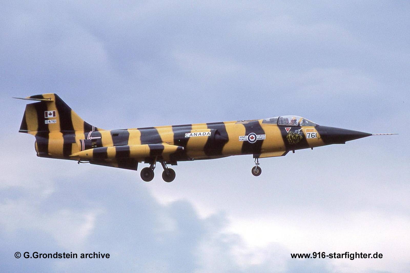 CF-104 "761" 439 squadron "Tiger" from CFB Baden-Sollingen at IAT-International Air Tattoo 1981 at RAF Greenham Common in June 1981 CF-104, Canadair Model CL-90, Lockheed Model 683-04-12, Canadair construction number 683A-1061, serial number 12761, built by Canadair first flight April 12, 1962, taken on service by RCAF as 12761 September 13, 1963 first unit 1 Air Division, Europe; re-serialed as 104761 effective June 1970 439 Squadron's "Tiger Meet" aircraft at Bitburg AB 1981, Canada won the Silver Tiger Trophy; struck off service by the CAF March 6, 1986taken on service by Turkey as 62-761 on March 13, 1986 withdrawn from use (date unknown); struck off service by the TuAF August 27, 1993; current status unknown; scrapped. copyright © G.Grondstein archive