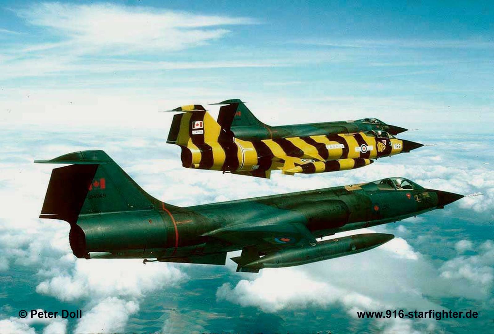 CF-104 "796" CAF 439 squadron "Tiger" from CFB Baden-Sollingen at RAF Gutersloh 1982 CF-104, Canadair model CL-90, Lockheed model 683-04-12, Canadair construction number 683A-1096, RCAF serial number 12796, built by Canadair first flight May 22, 1962, delivery date December 3, 1962; it was delivered to one of the wings in 1 Air Division; reserialed as 104796 effective June 1970 1980 Tactical Air Meet at Ramstein AB, wearing special markings on the wingtip tanks and a large white "D" on the tail it wore a large "D" on the tail and a red maple leaf on the tip tanks with a stylized blue "1 Canadian Air Group" superimposed on it. Each "i" was dotted with a small red maple leaf In 1982, it was 439 Squadron's participant in the "Tiger Meet" at RAF Gutersloh It was withdrawn from use on February 14, 1986 and was given to Turkeytaken into service with the TuAF as 62-796 on February 20, 1986 with 182 Filo code "8-796"; withdrawn from use by Turkey on April 29, 1994; scrapped. copyright © Peter Doll