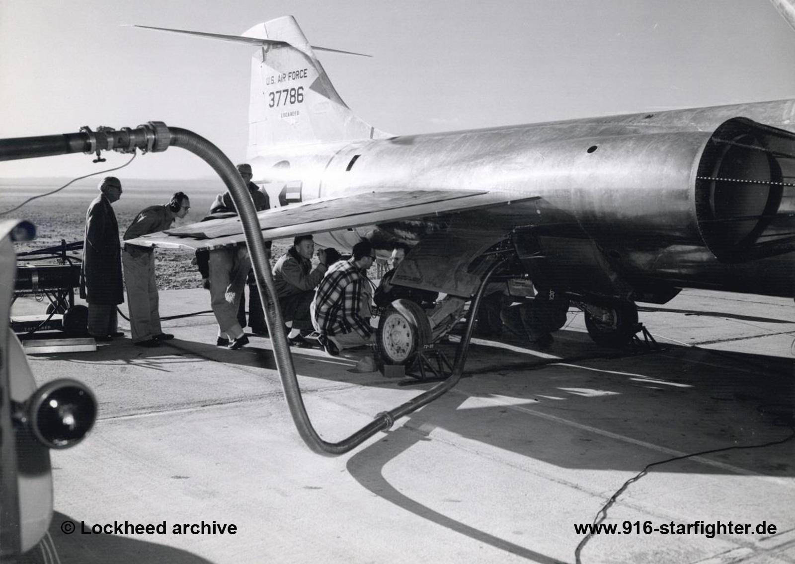 XF-104 53-7786 preparing for an engine run at Edwards 1954 XF-104, construction number 083-1001, serial number 53-7786, built by Lockheed The first XF-104 (53-7786) was ready in early 1954, and was trucked out to Edwards AFB in high secrecy during the night of February 24-25. Veteran Lockheed test pilot Tony LeVier was to do the initial testing. Taxiing runs began on February 27, 1954. On February 28, 1954, the XF-104 made an scheduled short hop of about five feet off the ground during a high speed taxiing run. Its first official flight took place on March 4, 1954. During that flight, the landing gear would not retract. After a low-speed flight of about 20 minutes, Tony LeVier landed. Some adjustments were made, and LeVier took off again, but the landing gear still would not retract. The problem turned out to be low pressure in the hydraulic system, which was fairly easy to correct. However, inclement weather kept the XF-104 on the ground until March 26, 1954 when flights three and four were carried out with the landing gear retracting adequately. copyright © Lockheed archive