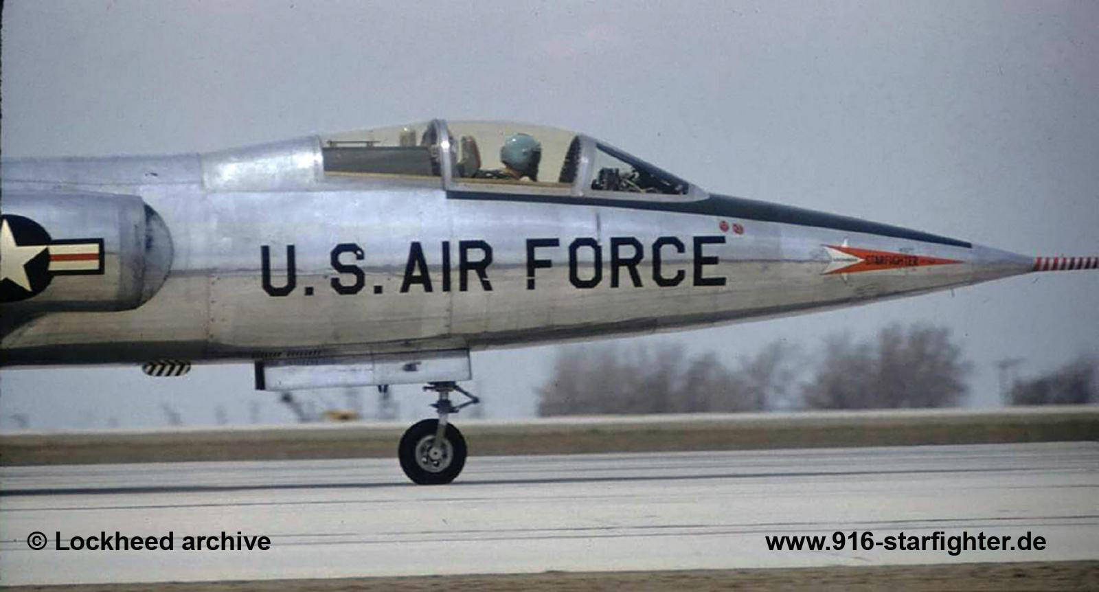 XF-104 53-7786 taxi out for another test flight XF-104, construction number 083-1001, serial number 53-7786, built by Lockheed The first XF-104 (53-7786) was ready in early 1954, and was trucked out to Edwards AFB in high secrecy during the night of February 24-25. Veteran Lockheed test pilot Tony LeVier was to do the initial testing. Taxiing runs began on February 27, 1954. On February 28, 1954, the XF-104 made an scheduled short hop of about five feet off the ground during a high speed taxiing run. Its first official flight took place on March 4, 1954. During that flight, the landing gear would not retract. After a low-speed flight of about 20 minutes, Tony LeVier landed. Some adjustments were made, and LeVier took off again, but the landing gear still would not retract. The problem turned out to be low pressure in the hydraulic system, which was fairly easy to correct. However, inclement weather kept the XF-104 on the ground until March 26, 1954 when flights three and four were carried out with the landing gear retracting adequately. copyright © Lockheed archive